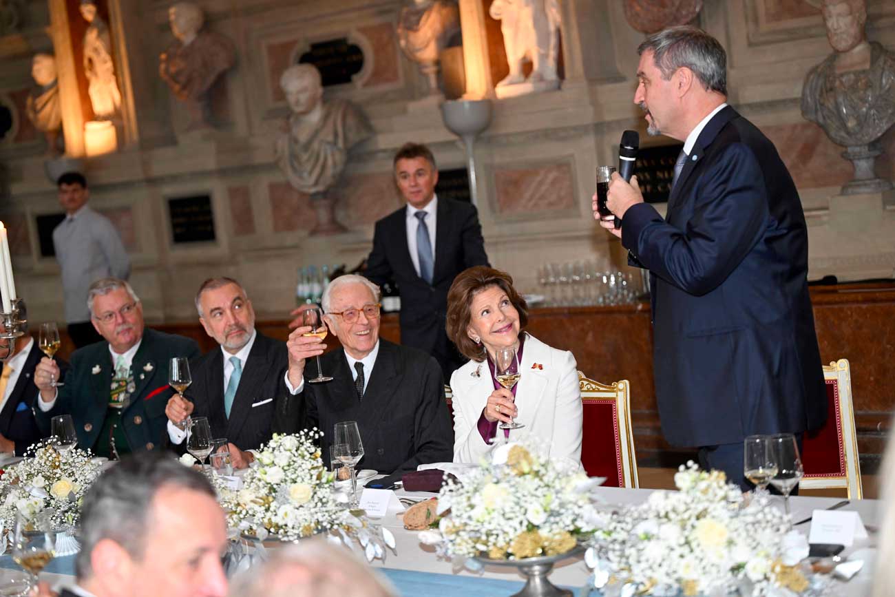 La reine Silvia a été accueillie avec les honneurs devant le palais de la Résidence, ancien palais des rois de Bavière. Avant le déjeuner organisé en son honneur, la reine a prononcé un discours devant les dignitaires bavarois invités à la cérémonie. Parmi eux se trouvaient le duc Franz de Bavière et son compagnon Thomas Greinwald. Le duc de Bavière, 92 ans, descendant du roi Louis III, est le chef de famille et l’actuel prétendant au trône de l’ancien royaume de Bavière. Le prince Poldi et la princesse Ursula de Bavière étaient également présents.