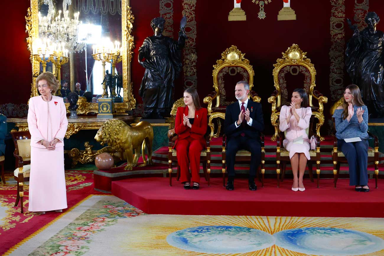 La reine Letizia, ainsi que ses filles, la princesse Leonor et l’infante Sofia, ont assisté à la cérémonie de distinction de leur belle-mère et grand-mère. Au cours de cette cérémonie, qui s’est déroulée au palais royal de Madrid, Felipe González, Miguel Herrero y Rodríguez de Miñón et Miquel Roca i Junyent ont eux aussi reçu la Toison d’or.