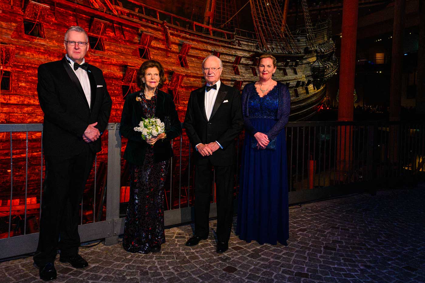 Le roi Carl XVI Gustaf et la reine Silvia entourés de Lars Amréus, directeur des Musées d’État d’histoire maritime, des transports et de la défense, et de Jenny Lind, directrice du musée Vasa (Photo : Dana Press/Bestimage)