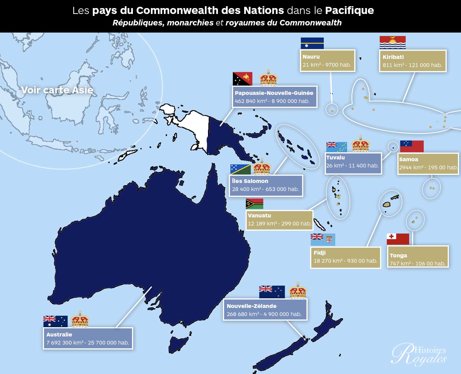 Certaines anciennes colonies britanniques, bien qu’aujourd’hui totalement indépendantes, ont toutefois gardé le souverain britannique comme chef d’État. Ces pays sont connus comme les royaumes du Commonwealth. Le roi Charles III est le souverain et chef d’État de ces 14 pays, en plus du Royaume-Uni, parmi lesquels on trouve le Canada, l’Australie ou encore la Nouvelle-Zélande.