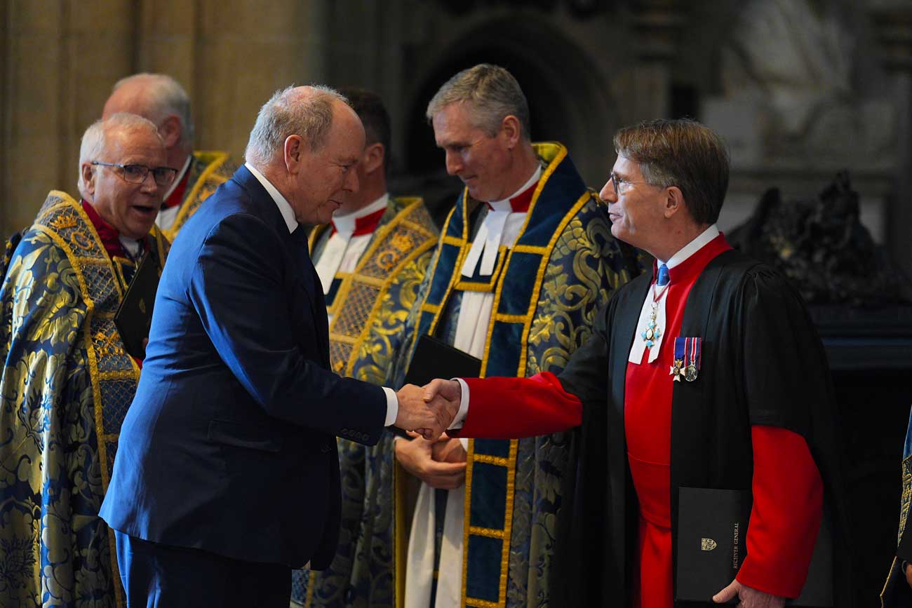 Le prince Albert II salue le clergé en entrant dans l’abbaye de Westminster (Photo : Aaron Chown/Pool Photo via AP/SIPA)