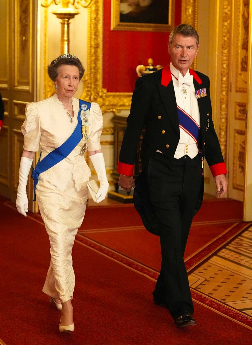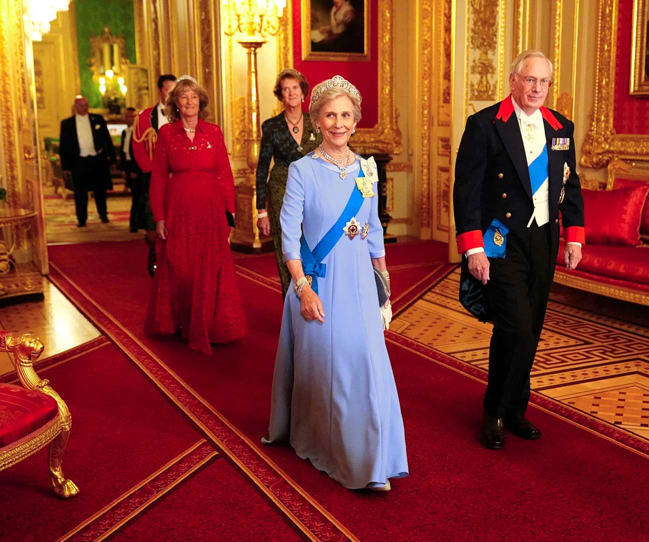 Le banquet d’État est toujours un grand moment, permettant à la reine Camilla de ceindre sa tiare. La reine Camilla portait une robe confectionnée par sa couturière habituelle, Fiona Clare, et son diadème de diamants et émeraudes. La princesse de Galles portait une robe à brocarts et broderies de la créatrice londonienne Phillipa Lepley. La princesse Anne portait un ensemble crème avec son diadème délicat serti d’aigues-marines. La duchesse de Gloucester portait une robe lavande et le diadème de la reine Mary aux motifs de chèvrefeuilles. Seule la duchesse d’Édimbourg était absente, en raison de son départ imminent pour le Japon, où elle retrouvera son époux, qui lui se trouve actuellement en Papouasie-Nouvelle-Guinée.