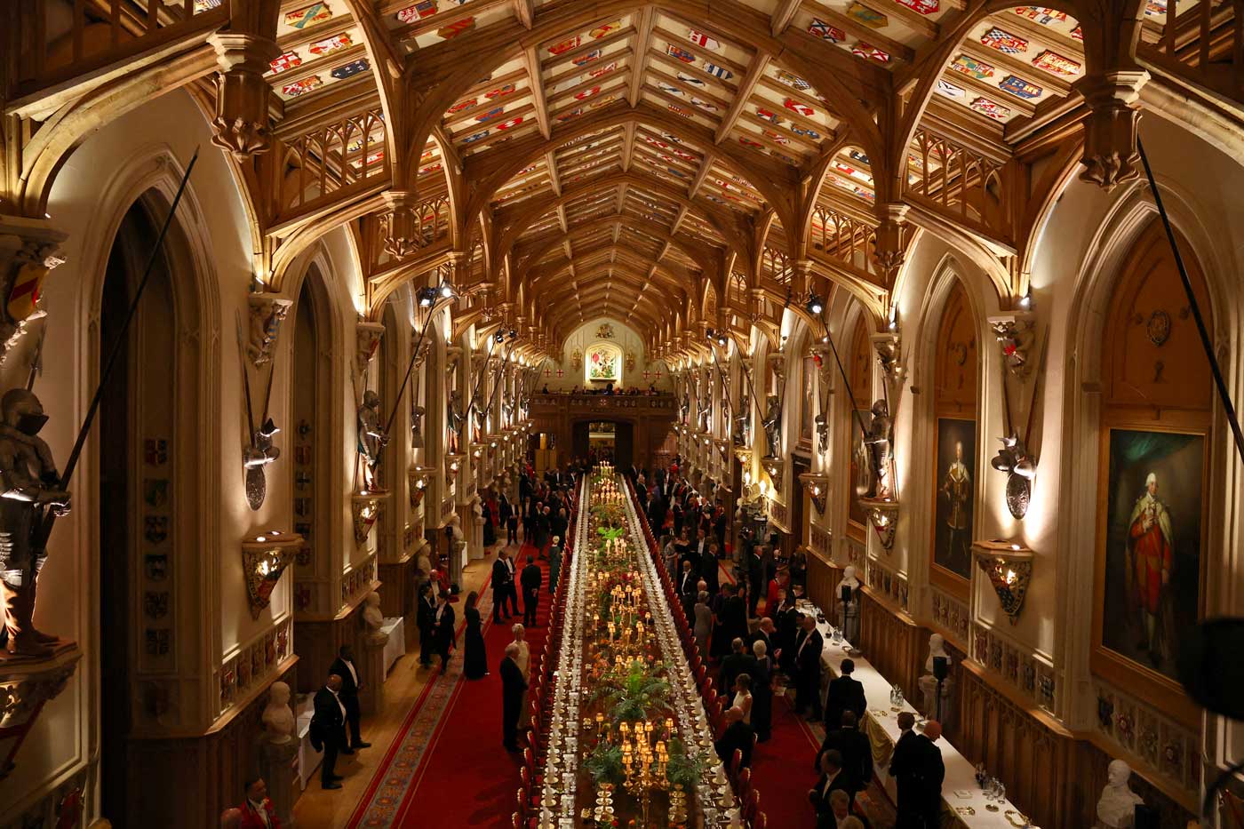 Les membres de la famille royale portaient l’ensemble de leurs décorations royales et militaires, dont le ruban bleu de l’ordre de la Jarretière pour les uns, et le ruban bleu bordé de lignes rouges et blanches de l’ordre royal de Victoria pour les autres. Le président américain a fait son entrée dans le Hall Saint-Georges, où était dressée une table de plus de 47 mètres de long, à côté du roi Charles III. La reine Camilla était accompagnée de Melania Trump. Le prince de Galles était accompagné de Paula Reynolds, présidente du réseau d’énergie National Grid, tandis que la princesse de Galles est arrivée à côté de Michael Boulos, l’époux de Tiffany Trump.