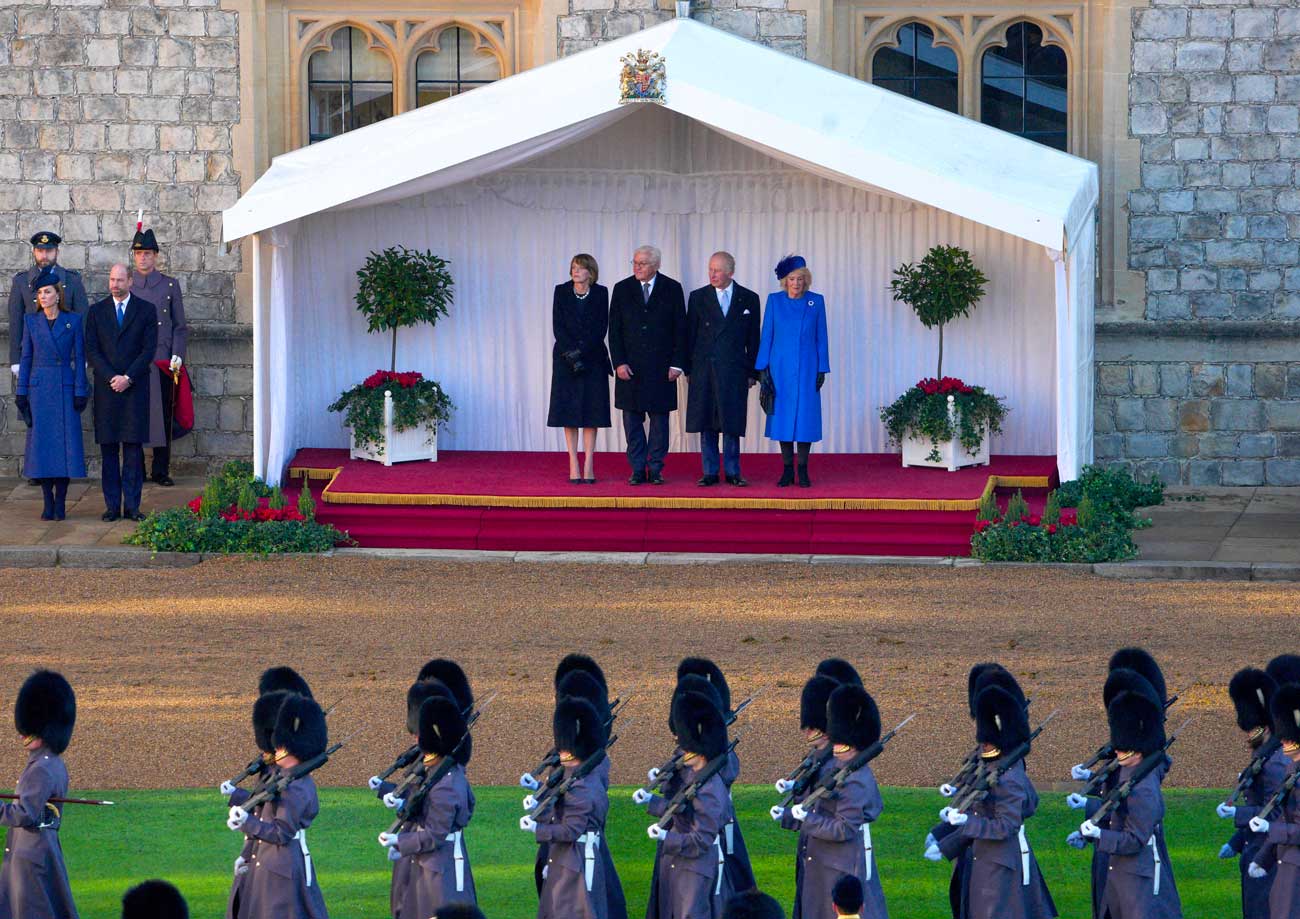 De l’aéroport, le président Steinmeier et la première dame ont rejoint Windsor, où ils ont été accueillis par le roi Charles III, 77 ans, et la reine Camilla, 78 ans. Ils ont rejoint le château de Windsor à bord de carrosses. Les cérémonies protocolaires ont dorénavant lieu à Windsor, la résidence du monarque située à 40 kilomètres de Londres, en raison de travaux au palais de Buckingham, qui empêchent d’accéder à certaines salles d’apparat durant les prochaines années.