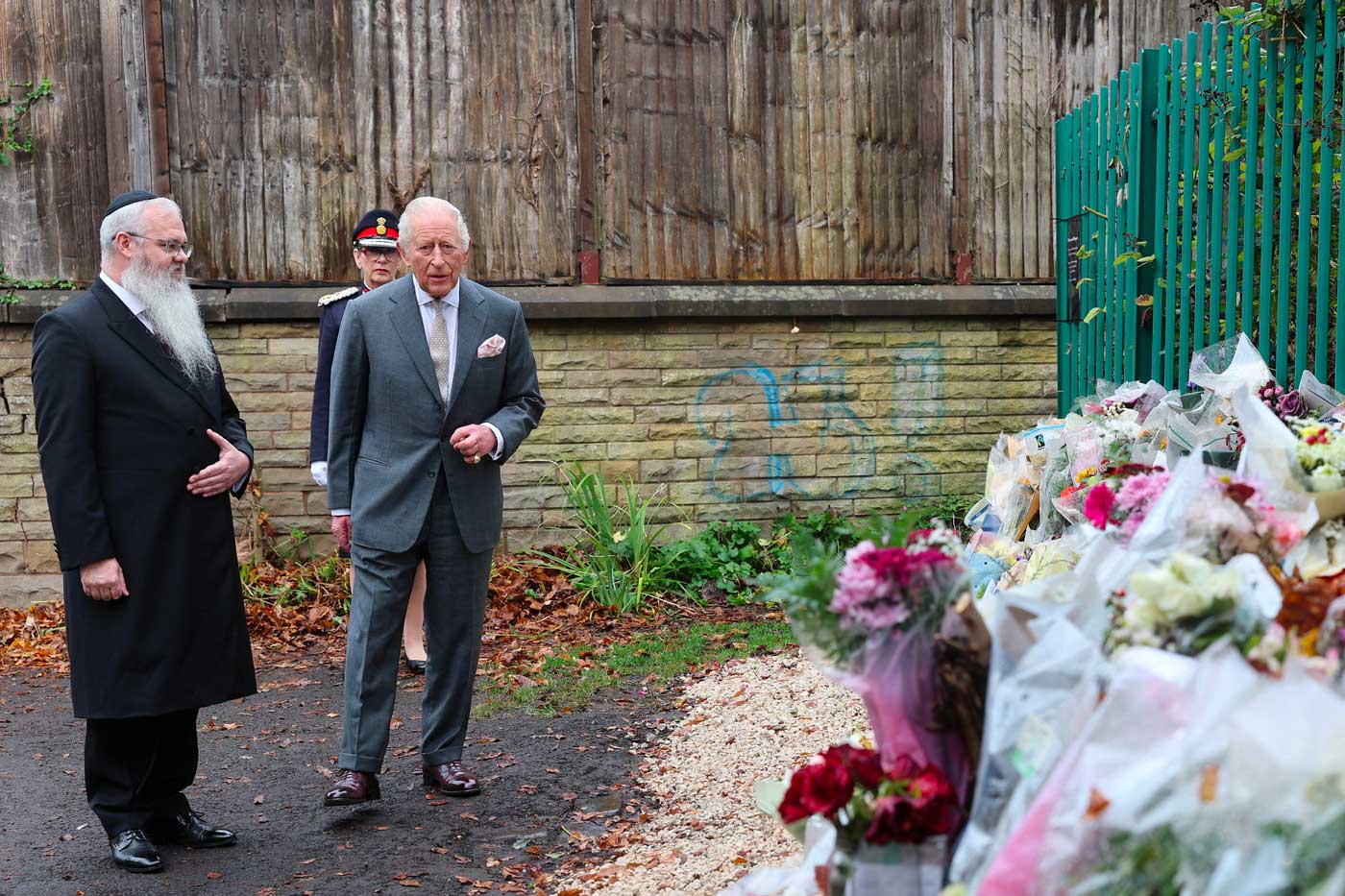 Le roi Charles III s’est recueilli devant le parterre de bouquets de fleurs qui ont été déposés en mémoire des victimes et en soutien à la communauté juive. Le roi Charles est aussi allé à la rencontre de la police et des premiers intervenants qui sont arrivés sur les lieux.