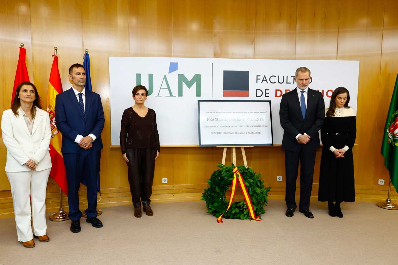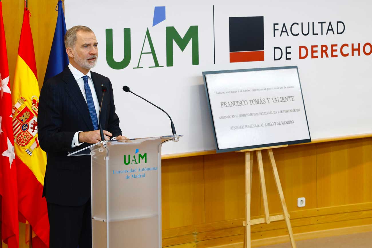 « Pour tous, il était un éminent juriste, un professeur, le deuxième président de la Cour constitutionnelle, un membre permanent du Conseil d’État. Pour moi, il était aussi un professeur et un mentor : j’ai eu la chance et le privilège d’être son étudiant en histoire du droit, durant ma première année de droit, ici à l’UAM ». Le roi Felipe a ajouté : « Nous devons notre coexistence démocratique à des personnes comme Francisco Tomás y Valiente et à des centaines de fonctionnaires de tous horizons : policiers, gardes civils, militaires, juges et procureurs ; mais aussi aux chefs d’entreprise, petits et grands, et à tous les citoyens, y compris les enfants. Tous ont un nom, un prénom, une famille, une histoire, des projets d’avenir. Cela nous amène aux 853 victimes reconnues du groupe terroriste ETA en plus de 40 ans. Je vous rappelle que nombre de ces meurtres restent impunis malgré le temps écoulé. »