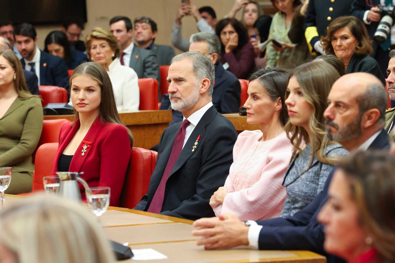 Le roi Felipe VI, 57 ans, chef de l’État espagnol depuis l’abdication de son père en 2014, a présidé cette cérémonie, entouré de son épouse, la reine Letizia, 53 ans, et de leurs deux filles, la princesse Leonor, princesse des Asturies, 20 ans, et l’infante Sofia, 18 ans. L’acte officiel était organisé, ce 21 novembre 2025, quelques heures après la cérémonie de remise des insignes de l’ordre de la Toison d’or à la reine Sofia, à un ancien premier ministre et aux deux pères fondateurs de la Constitution. Il s’agit des quelques discrets événements officiels organisés pour marquer un demi-siècle de démocratie retrouvée.