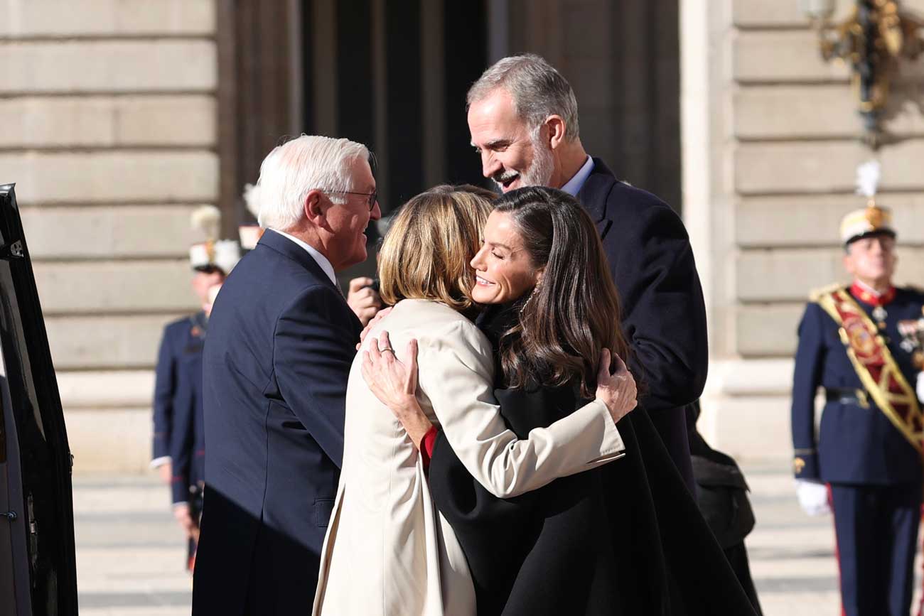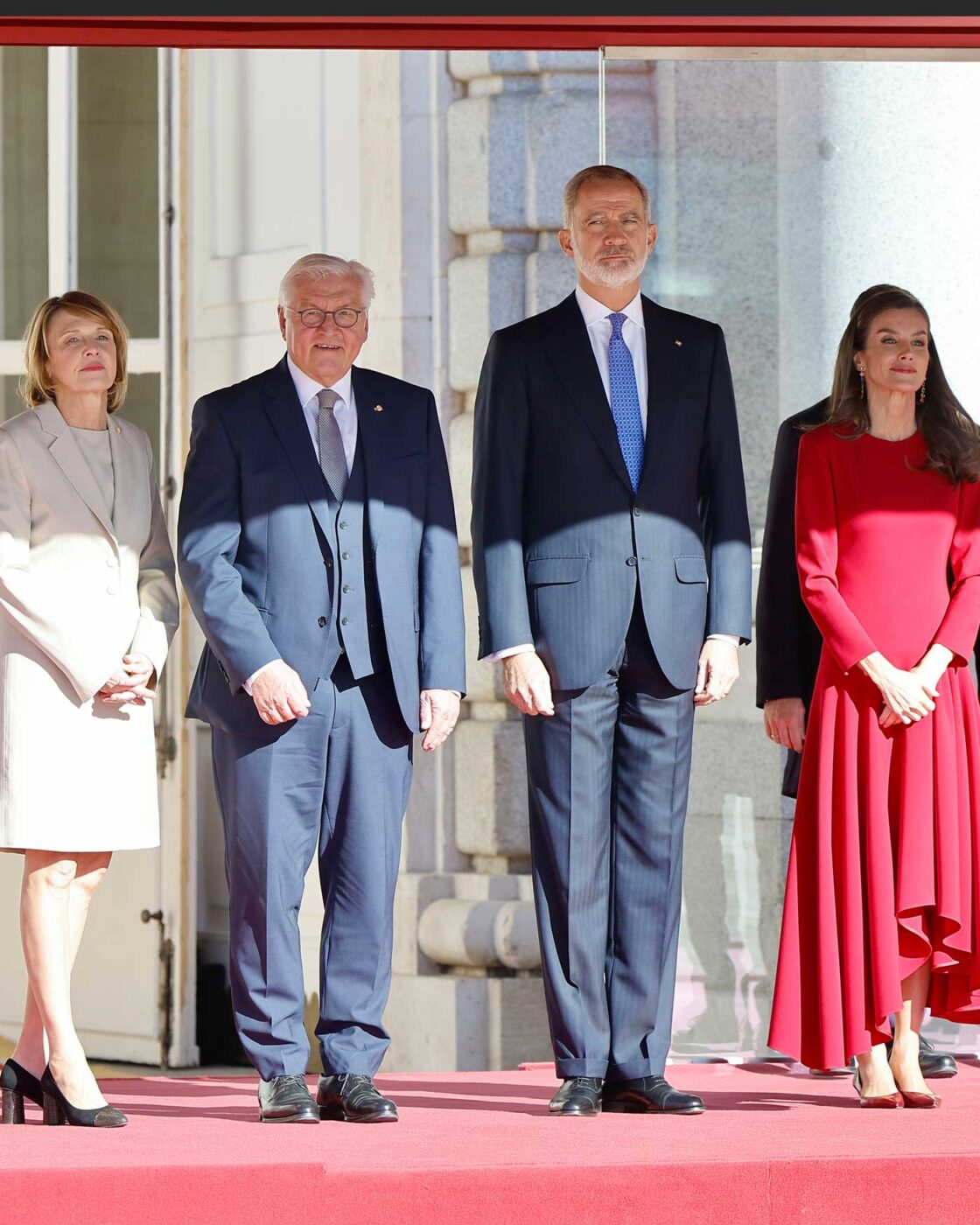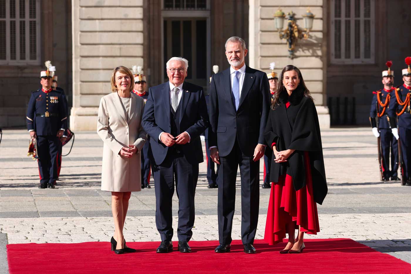 Le roi Felipe VI et la reine Letizia ont accueilli leurs invités allemands dans la cour du palais royal de Madrid. Comme le veut la tradition, le chef d’État hôte accueille le chef d’État invité au cours d’une cérémonie militaire, en présence des épouses. La reine Letizia et la première dame allemande Elke Büdenbender ont observé le roi d’Espagne et le président allemand passer en revue les troupes puis marquer un instant de respect durant les deux hymnes nationaux.
