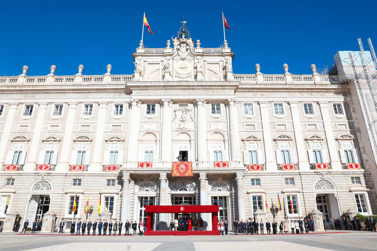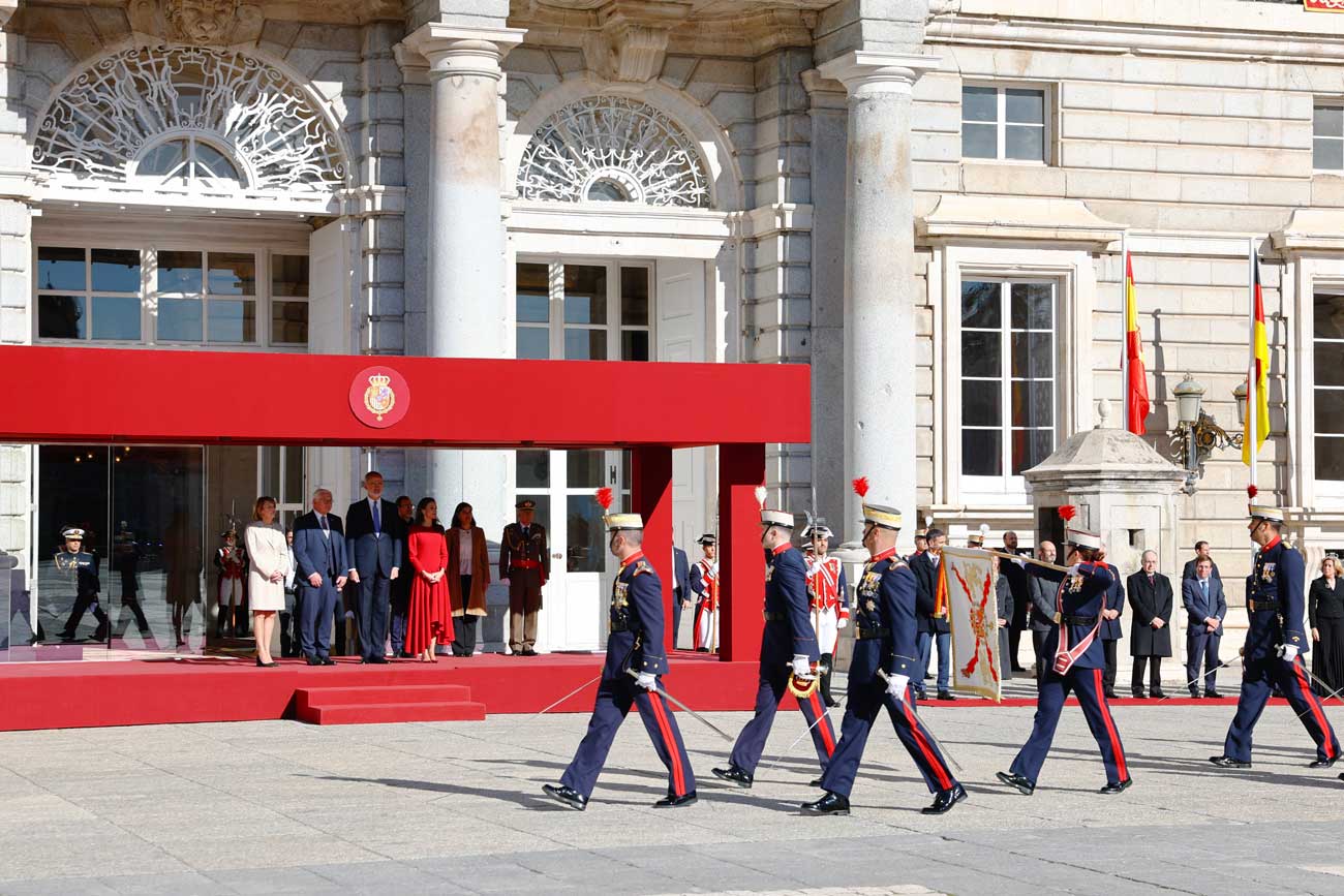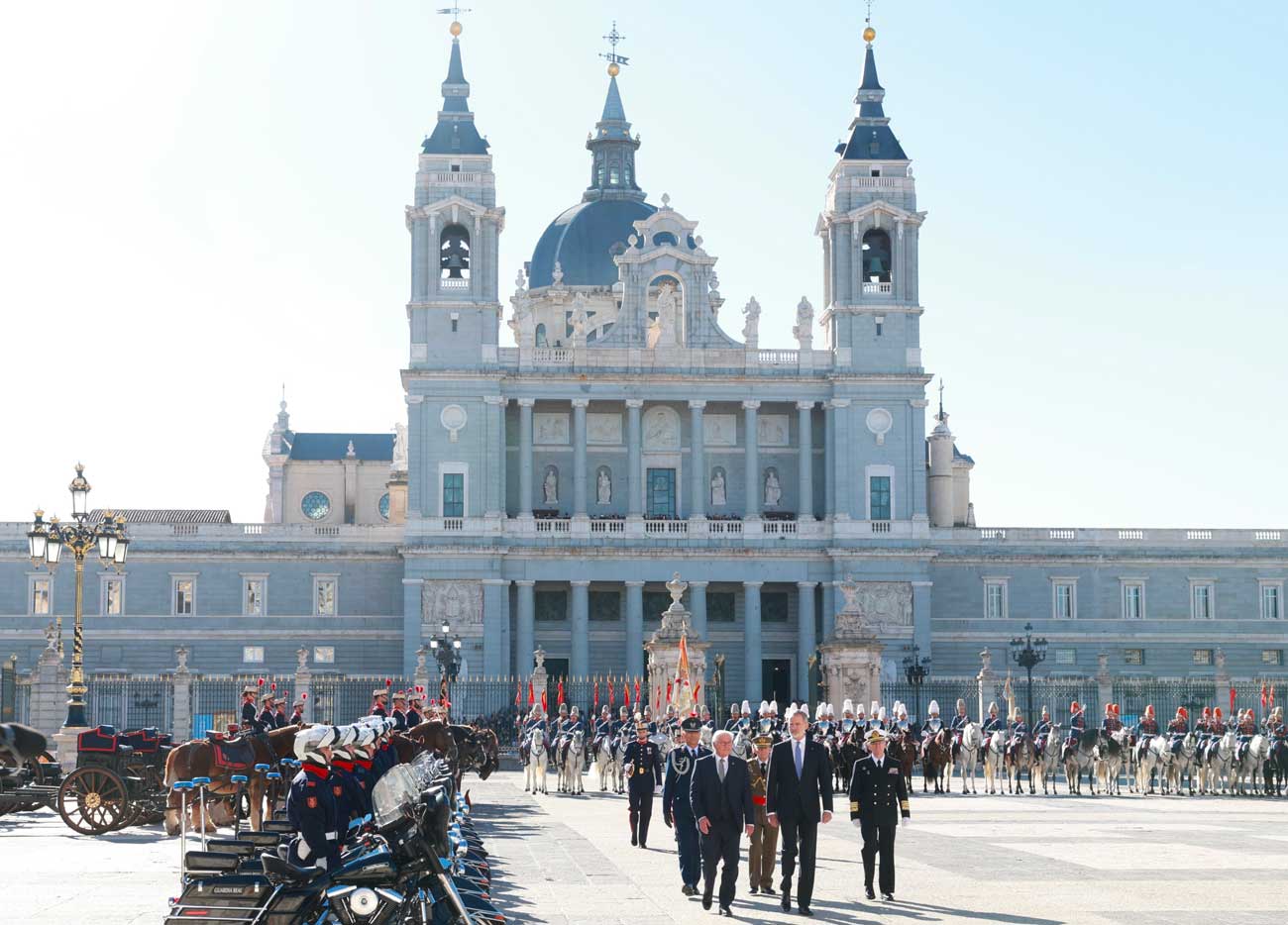 Le roi Felipe VI et la reine Letizia ont accueilli leurs invités allemands dans la cour du palais royal de Madrid. Comme le veut la tradition, le chef d’État hôte accueille le chef d’État invité au cours d’une cérémonie militaire, en présence des épouses. La reine Letizia et la première dame allemande Elke Büdenbender ont observé le roi d’Espagne et le président allemand passer en revue les troupes puis marquer un instant de respect durant les deux hymnes nationaux.