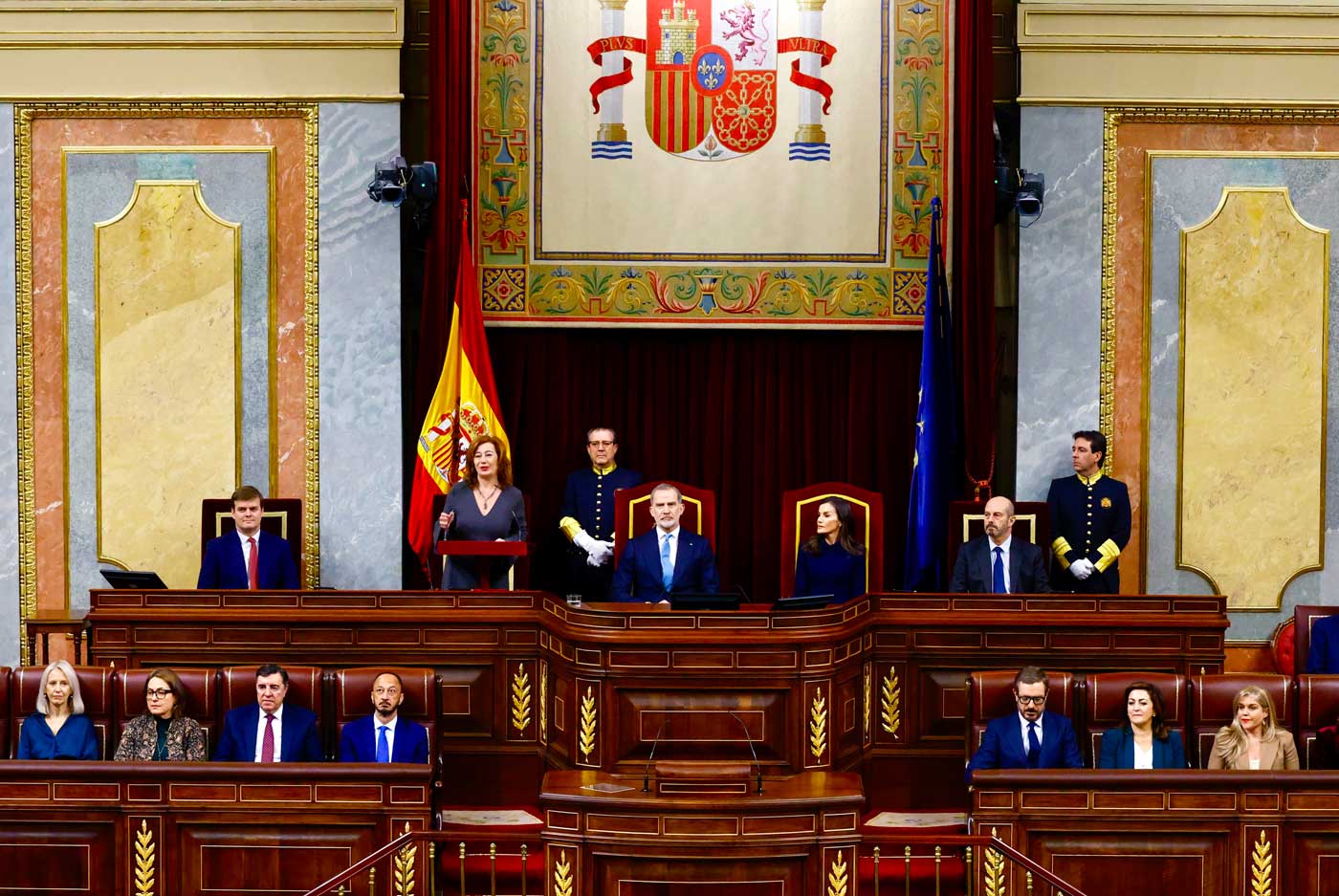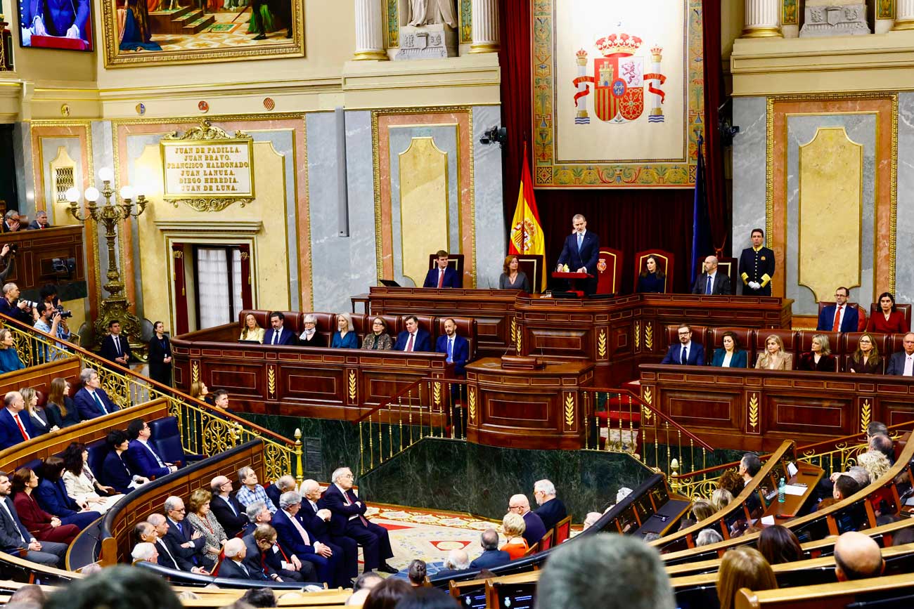 Le roi Felipe VI s’est exprimé devant les Cortes Generales, soit les deux chambres parlementaires réunies, après le discours de Francina Armengol, présidente du Congrès des députés, et celui de Pedro Rollán, président du Sénat. Le président du gouvernement, Pedro Sánchez, le président de la Cour constitutionnelle, Cándido Conde-Pumpido et la présidente de la Cour suprême et du Conseil général du pouvoir judiciaire, María Isabel Perelló, ont assisté à la cérémonie.