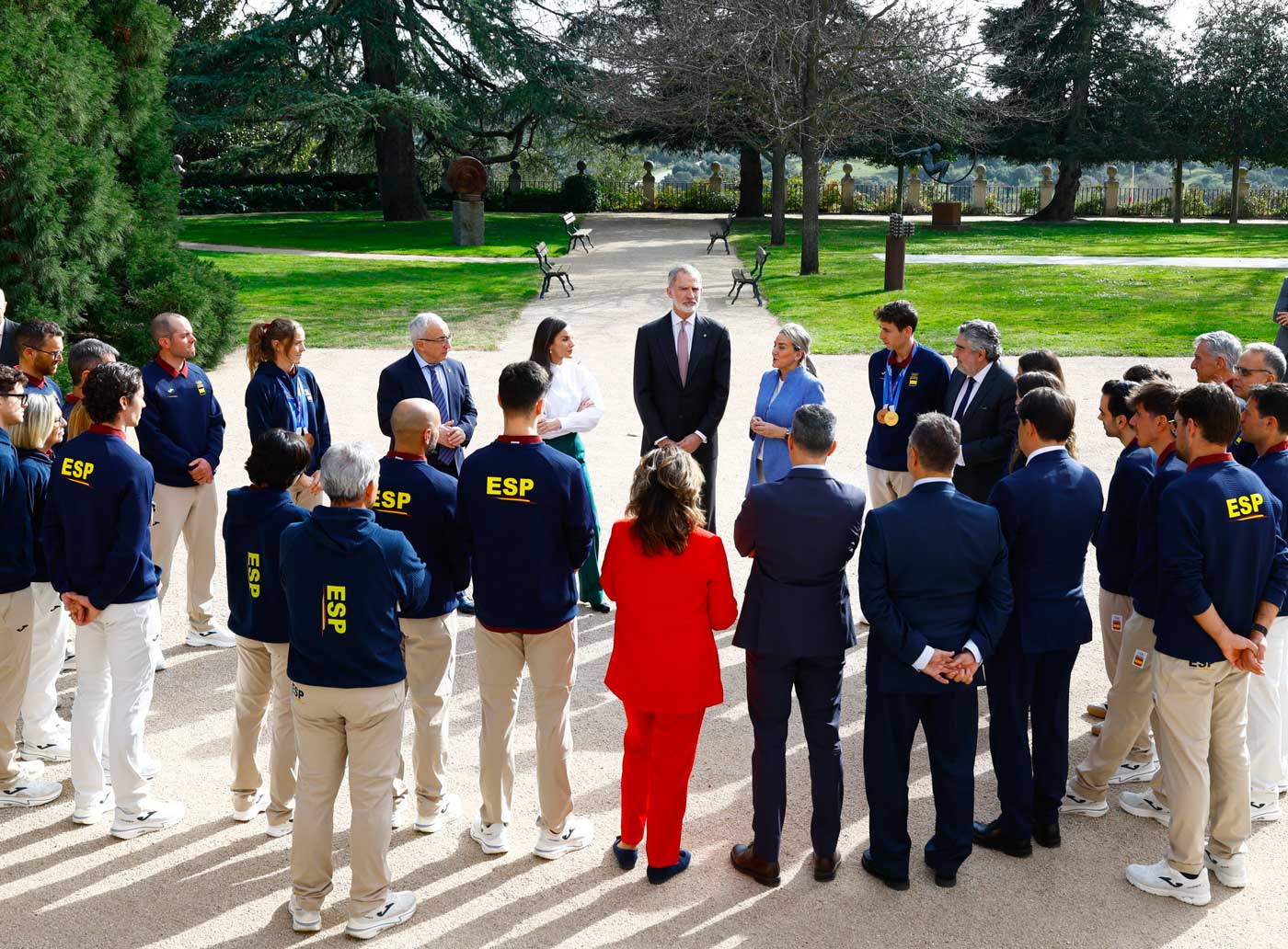 Le roi Felipe et la reine Letizia ont pu échanger avec les sportifs qui ont participé aux disciplines du ski de randonnée, ski de fond, snowboard, patinage artistique, patinage de vitesse et ski alpin. Les souverains espagnols ont félicité les deux doubles médaillés espagnols lors de cette réception qui se tenait dans un jardin du palais.