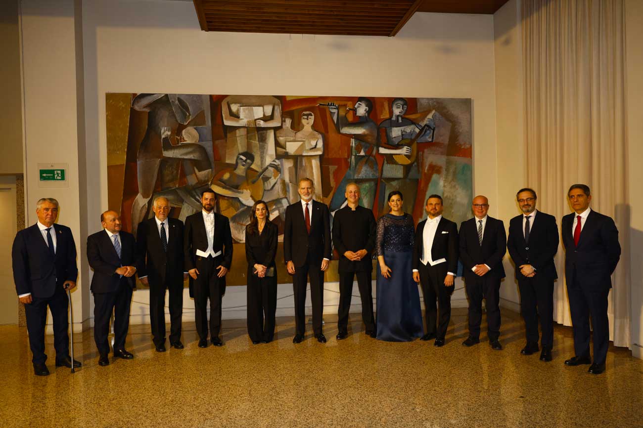 Le roi Felipe et la reine Letizia posent avec des représentants de l’orchestre de la RTVE et les solistes (Photo : Casa de SM el Rey)