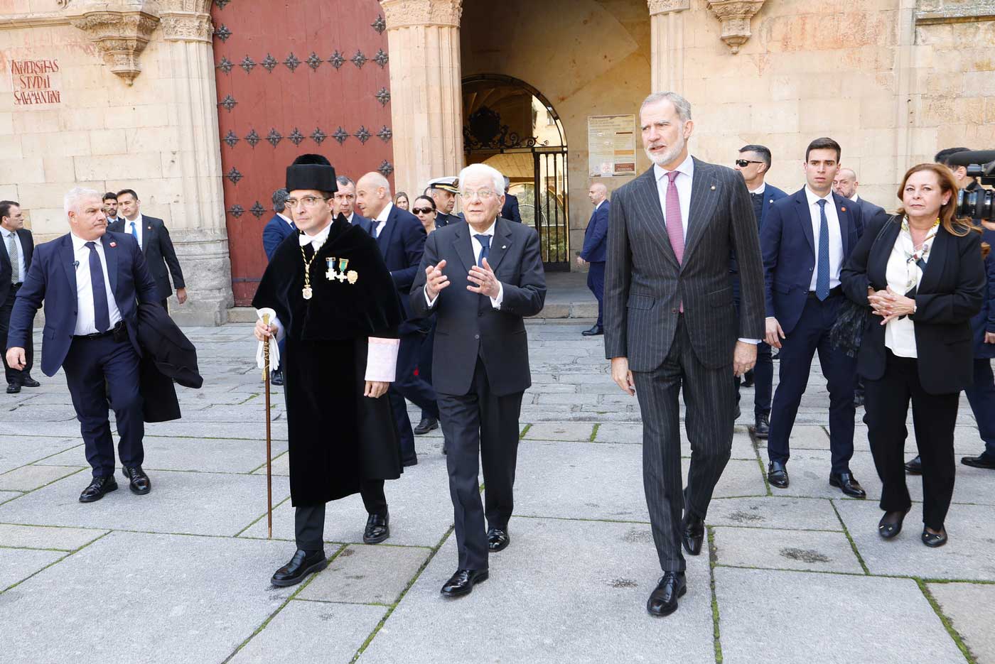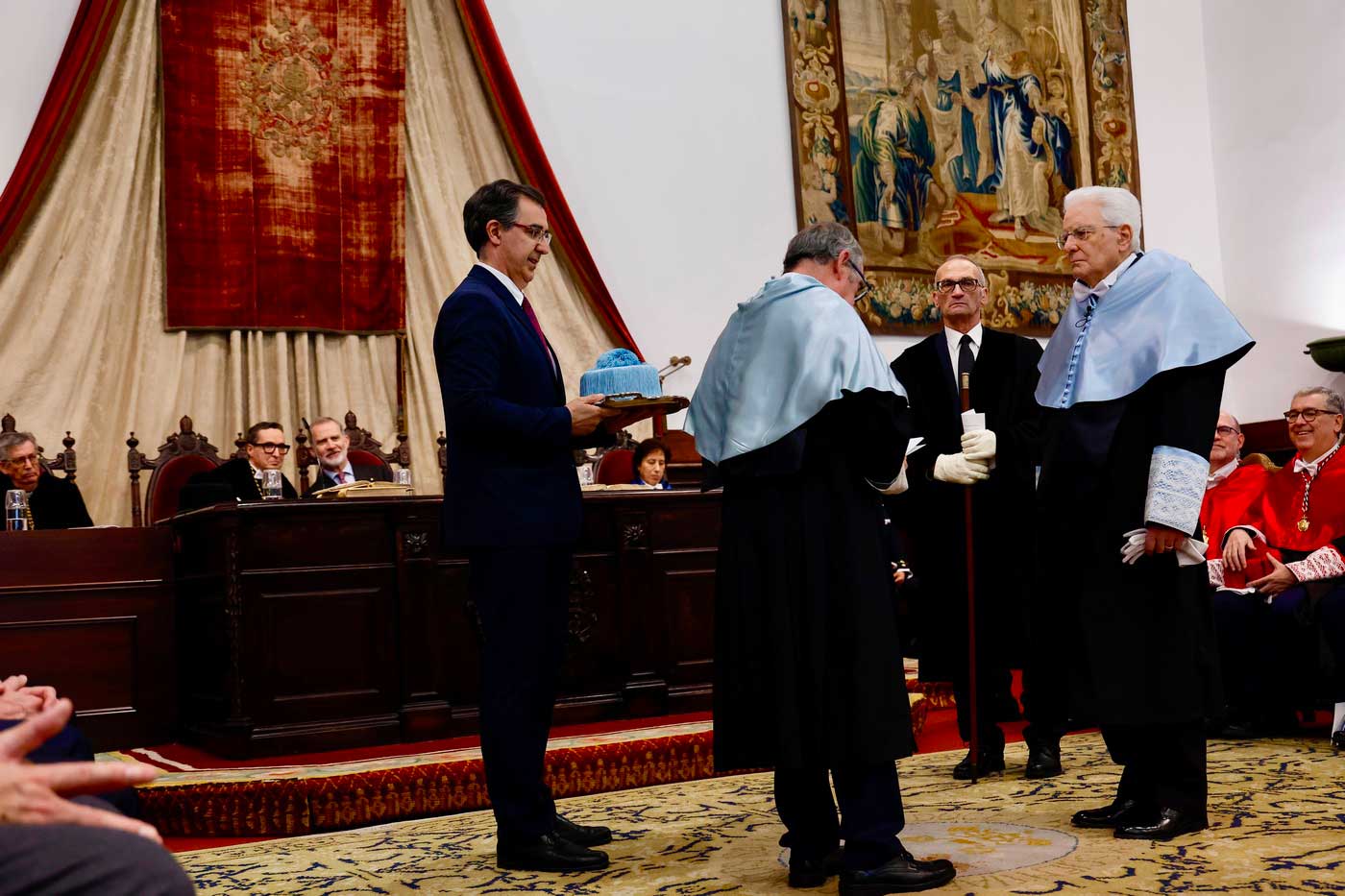 La direction de l’université, dont le recteur, a accueilli les deux chefs d’État, puis un cortège s’est formé pour rejoindre la salle principale où s’est déroulée une cérémonie d’investiture particulière. Le président italien a été investi en tant que docteur honoris causa de l’université, sous le regard du roi Felipe. Le président a reçu les différents insignes et décors, dont le couvre-chef bleu pâle assorti à la toge. Plusieurs discours ont été prononcés et son éloge a été prononcé par le professeur émérite de philologie italienne Vicente González Martín.