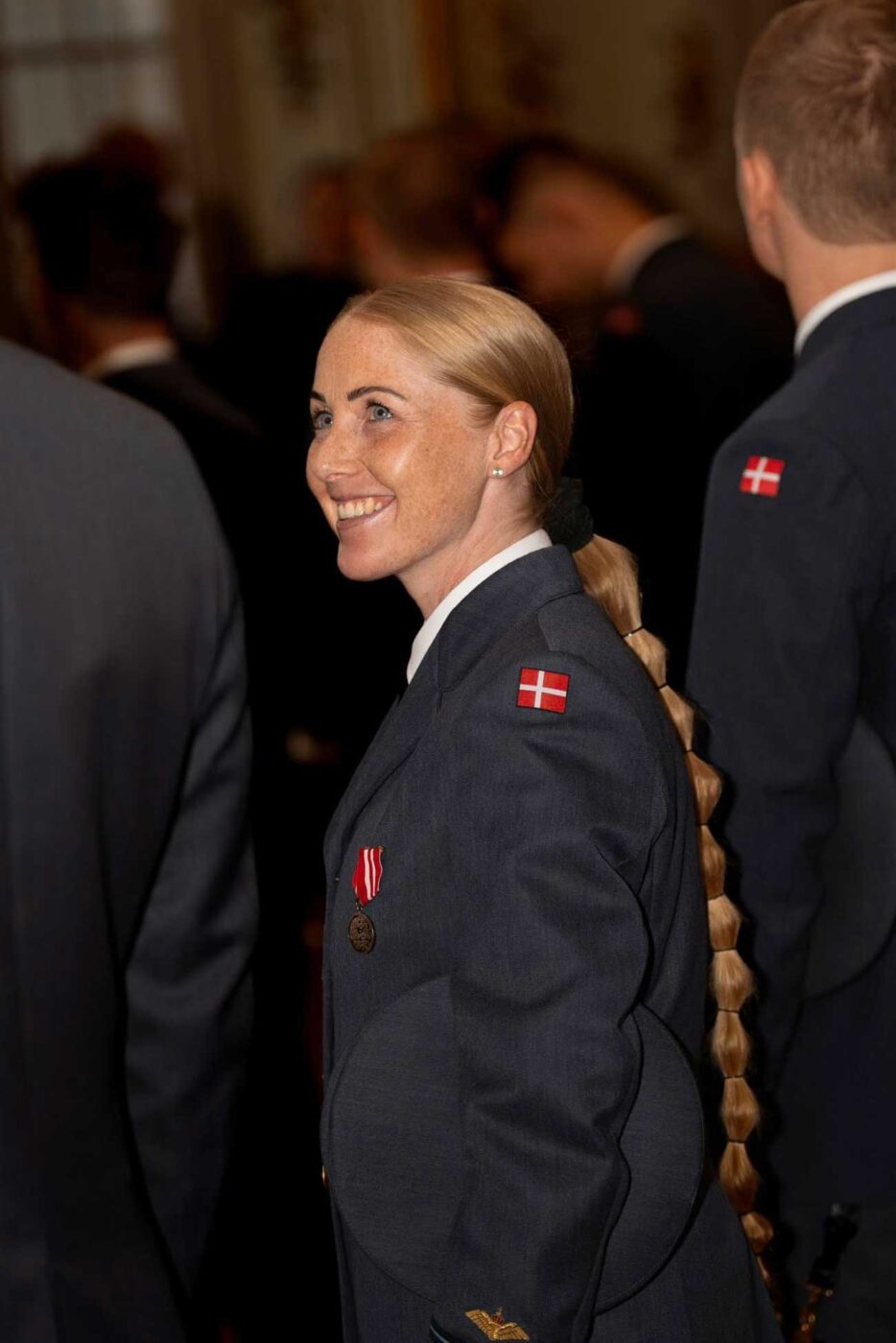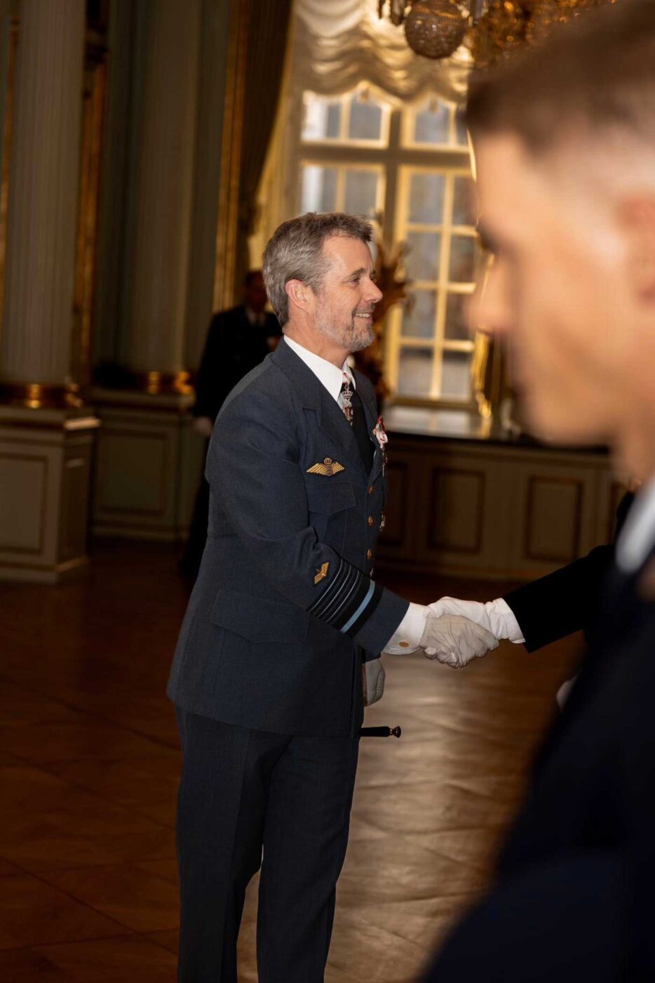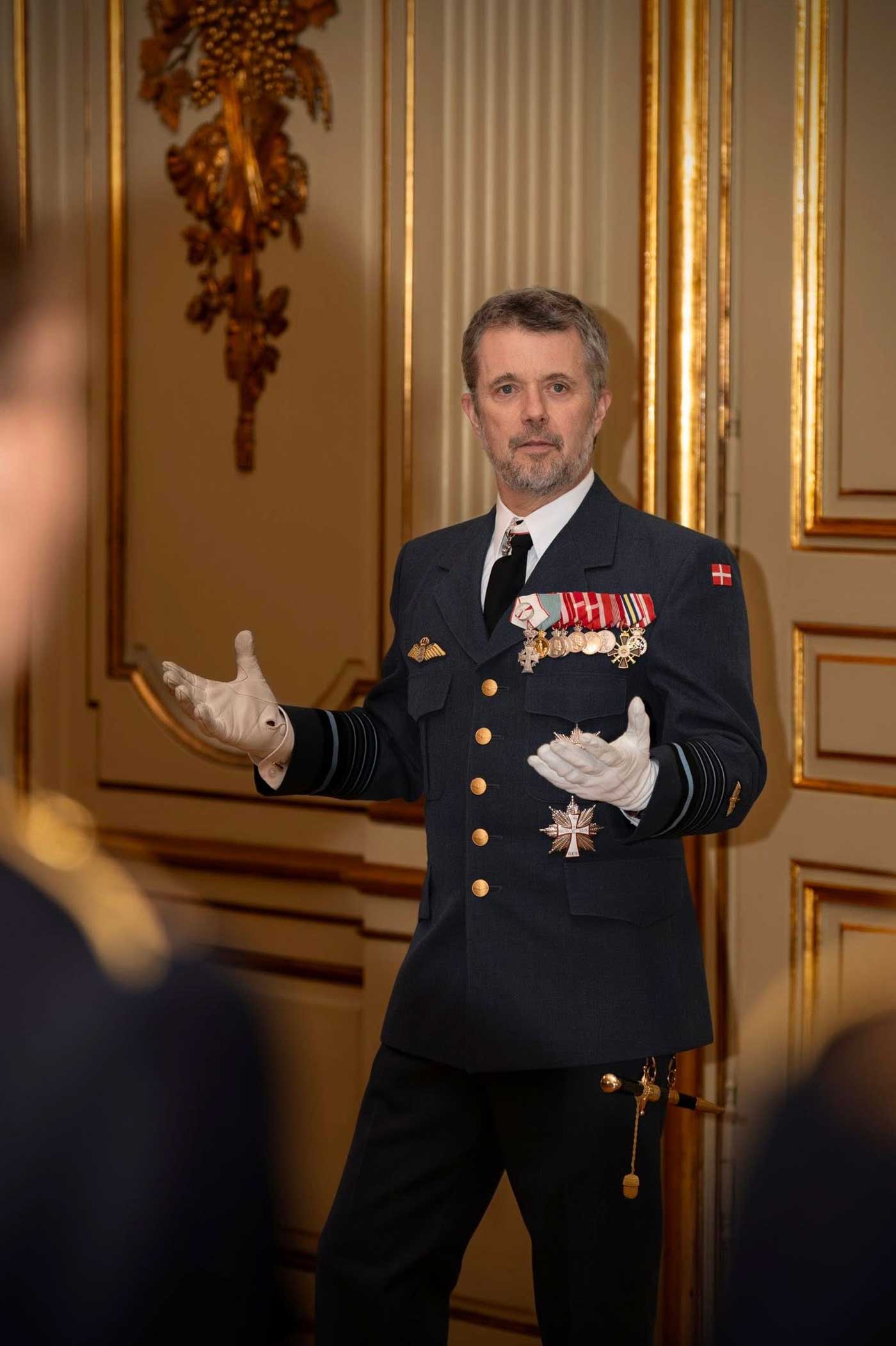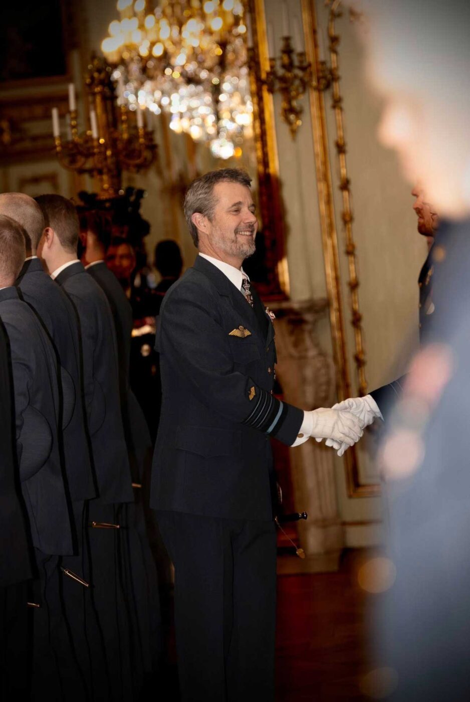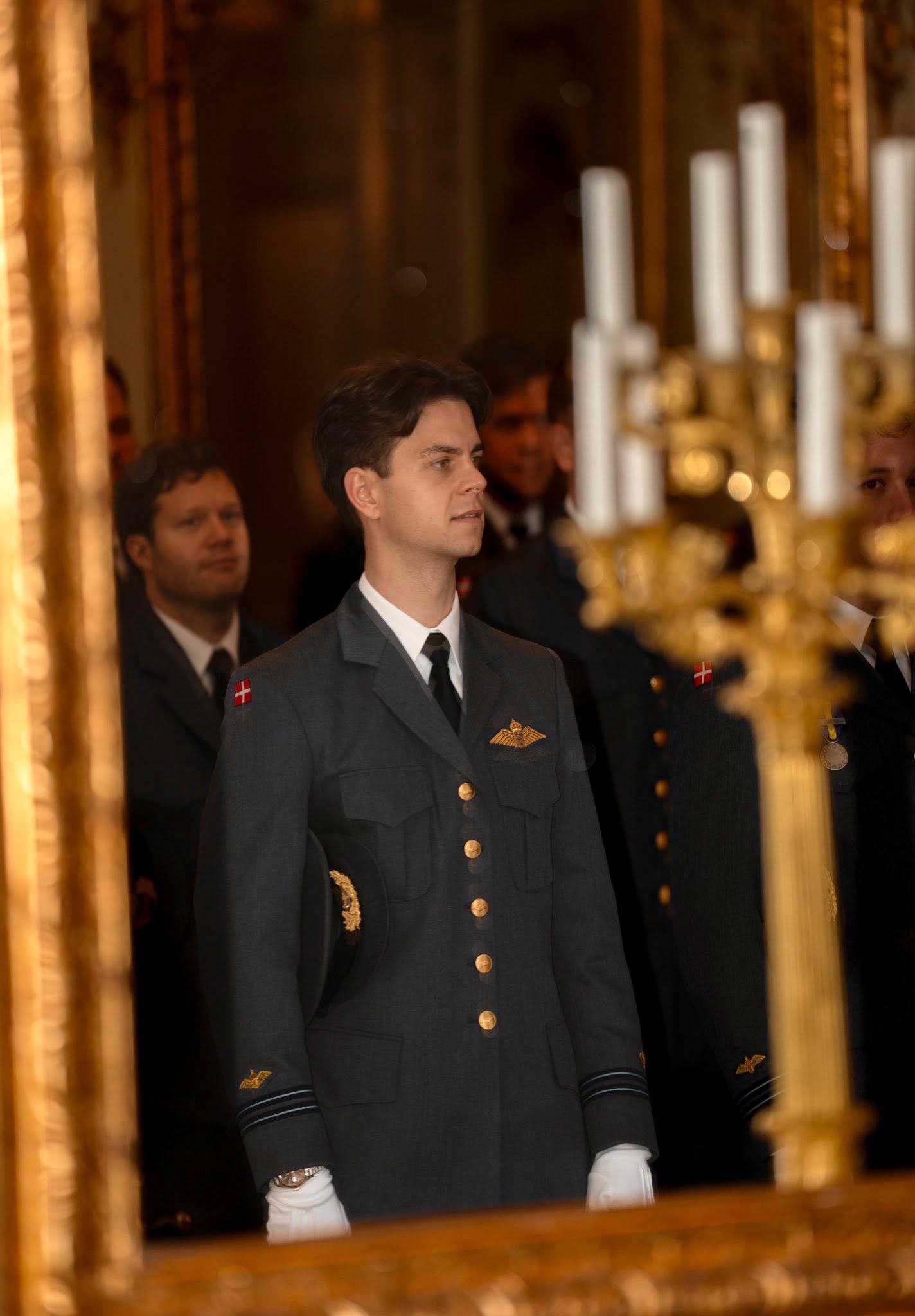 Les souverains danois ont pour tradition de rencontrer les nouveaux premiers-lieutenants de l’Armée de l’Air pour les féliciter de leur grade. Ceux-ci se sont alignés en rang devant le chef de l’État, dans la salle des Chevaliers. Le roi Frederik X a choisi de respecter cette tradition initiée par ses ancêtres.
