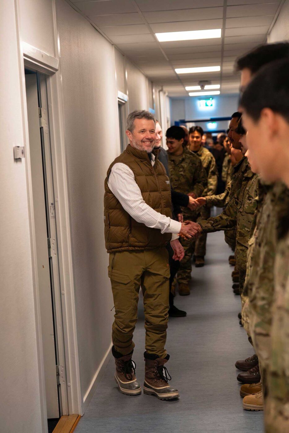 À Kangerlussuaq, le thermomètre affichait des températures négatives extrêmes. Le roi Frederik portait une veste rembourrée pour affronter les -20 degrés et rencontrer des étudiants qui participaient à un programme de l’École de formation de base arctique. Le souverain danois a échangé avec des élèves et du personnel de l’école, qui dispense une formation militaire de base à des jeunes conscrits.