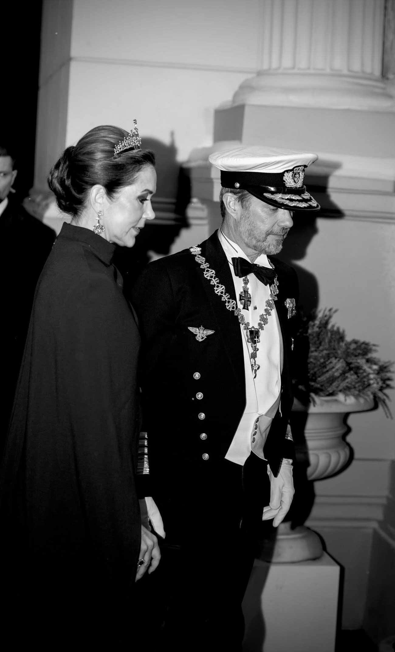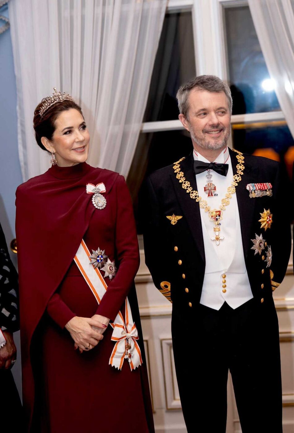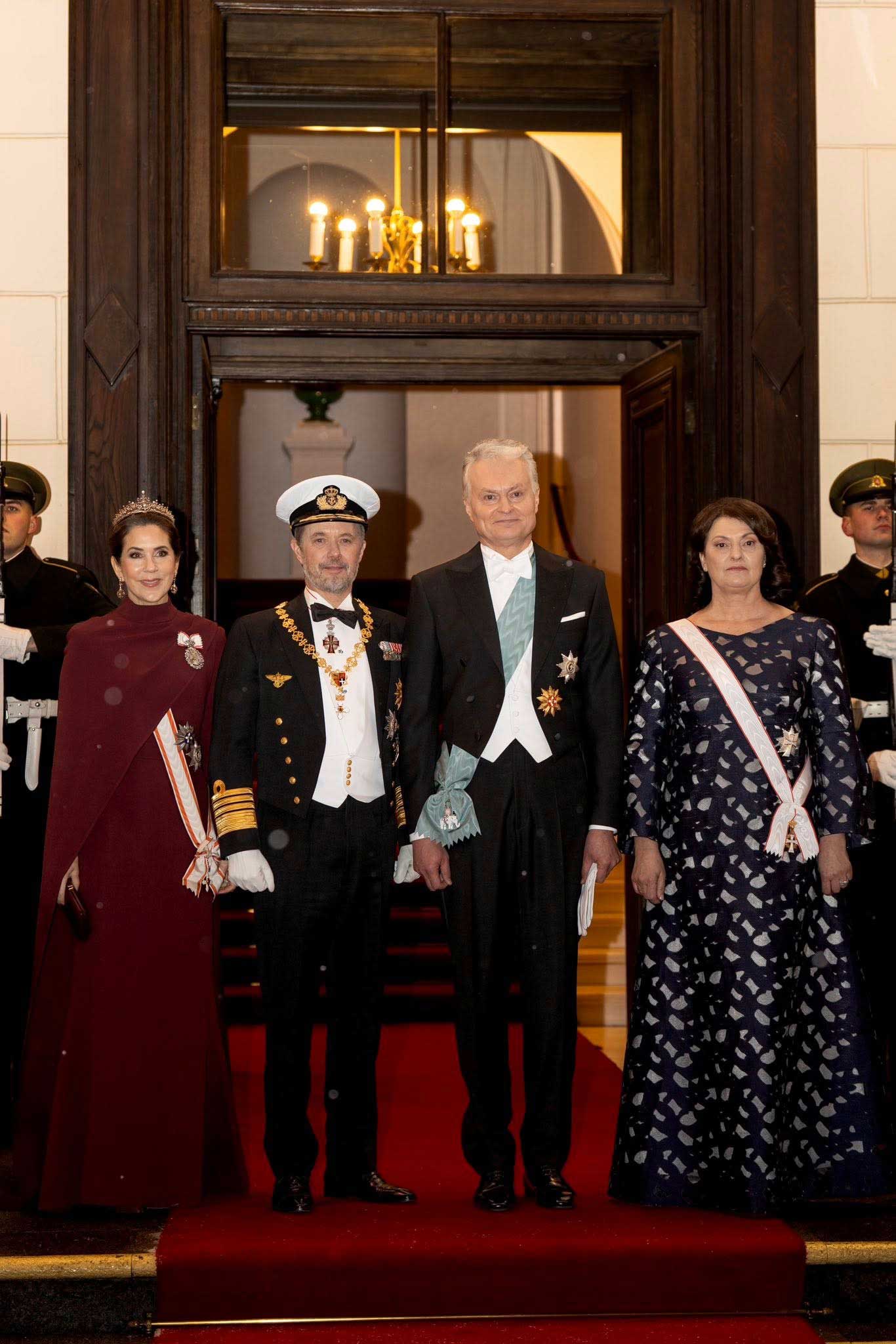 Le roi Frederik X dans son uniforme de gala d’amiral de la Marine avec le collier d’or de l’ordre de Vytautas le Grand, la plaque étoilée de l’ordre de l’Éléphant à la taille et l’insigne de l’ordre de Dannebrog au cou. La reine Mary porte le ruban blanc à liserés orange de grand-croix de l’ordre de Vytautas le Grand ainsi que la plaque étoilée à la taille, à côté de la plaque étoilée de l’ordre de Dannebrog. Elle porte aussi la médaille de l’ordre de la famille du roi Frederik X, qui comprend un nœud et un portrait de son époux encerclé de diamants (Photo : Kongehuset)