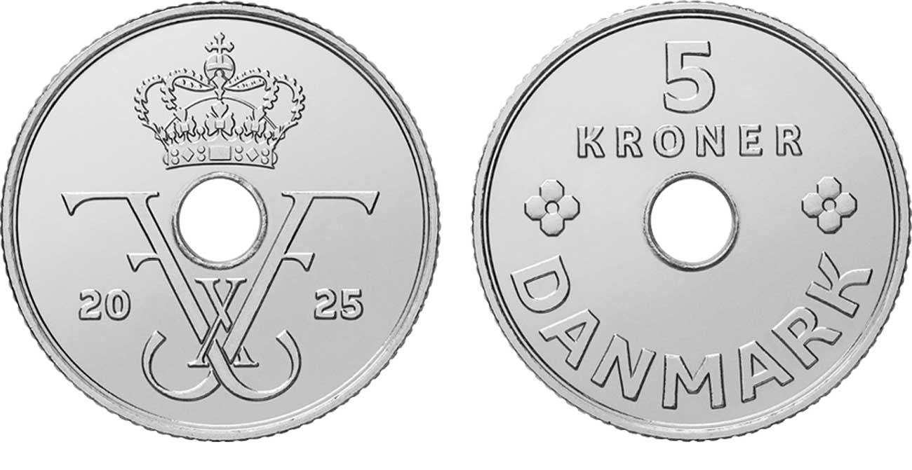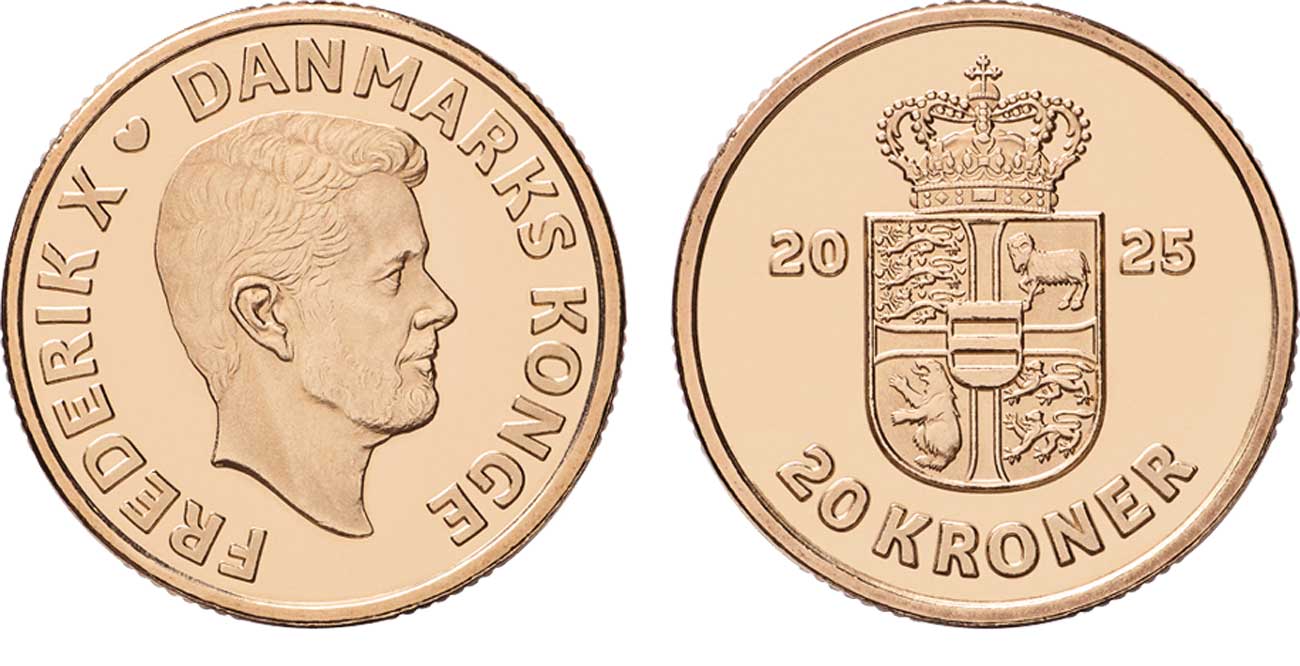La Banque nationale du Danemark a frappé de nouvelles pièces. Les pièces de 20 et 10 couronnes auront dorénavant le portrait de profil de Frederik sur une face et ses armoiries sur l’autre face. Les pièces de 1, 2 et 5 couronnes auront dorénavant le monogramme du roi Frederik sur une face et la mention « Danmark » sur l’autre face. Un tout petit élément graphique, représentant quatre mini-octogone formant un carré, a été ajouté à ces trois pièces. Cet élément représente les quatre palais d’Amalienborg situés au bord d’une place centrale de Copenhague. Il existe une petite pièce de 50 øre (50 centièmes de couronne) qui reste inchangée. Les pièces à l’effigie de la reine Margrethe continuent à circuler jusqu’à leur disparition car elles ne seront plus produites.