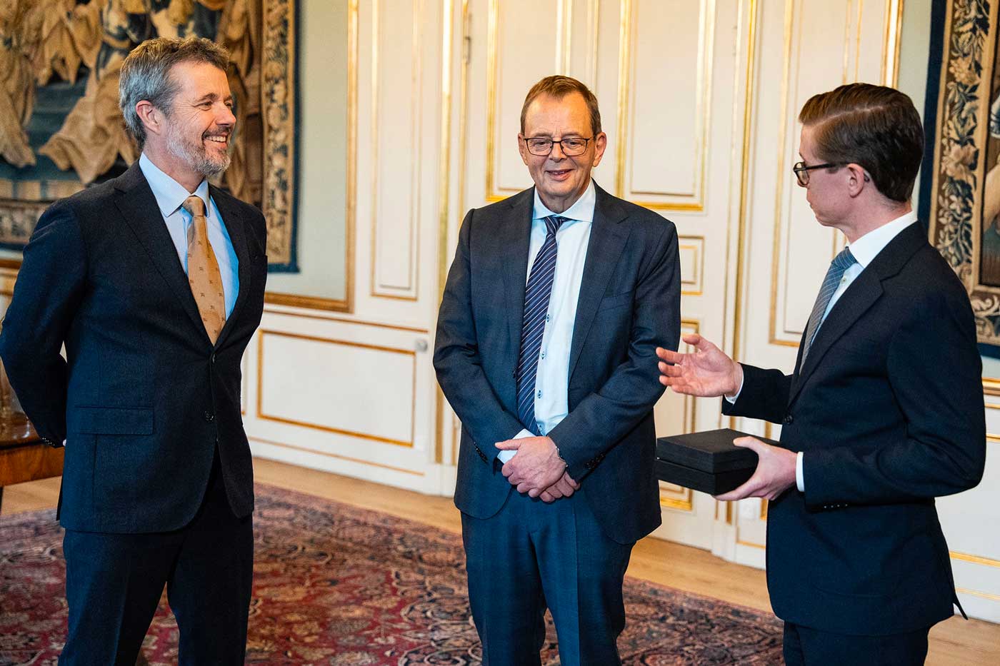 Le roi Frederik X a accueilli il y a deux semaines chez lui, au palais Frédéric VIII d’Amalienborg, le trésorier en chef Niels Kaas et gouverneur de la Banque nationale, Christian Kettel Thomsen (Photo : Kongehuset)