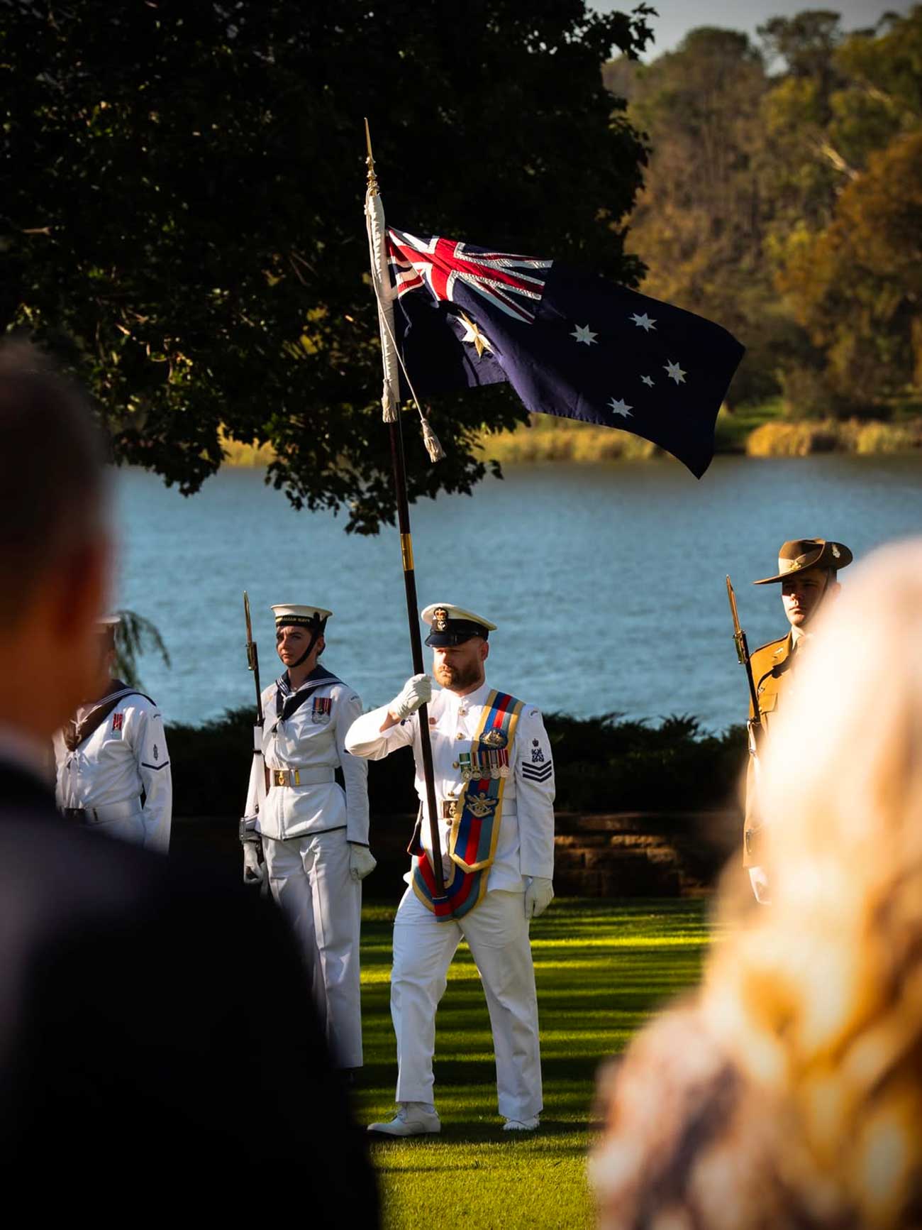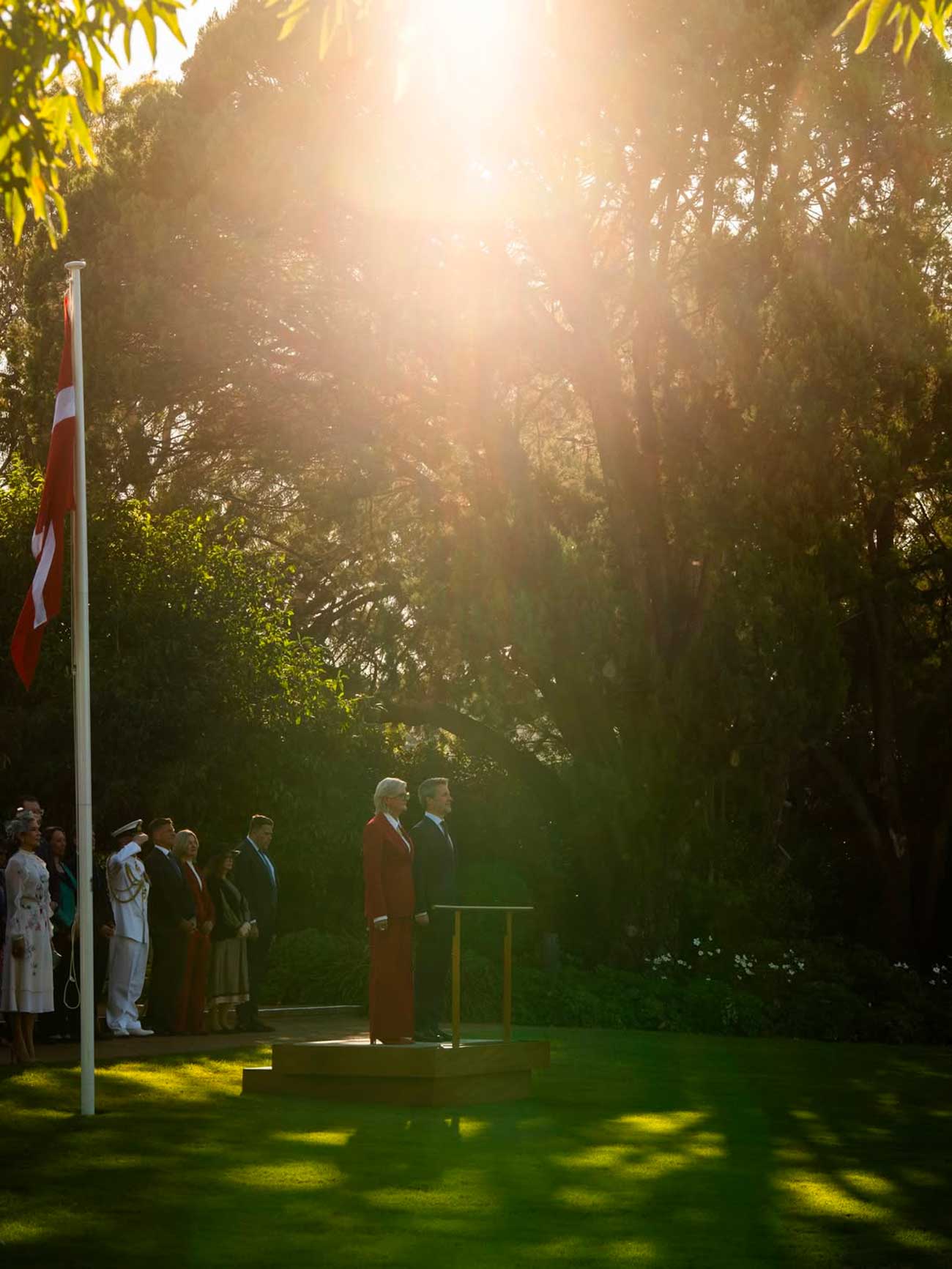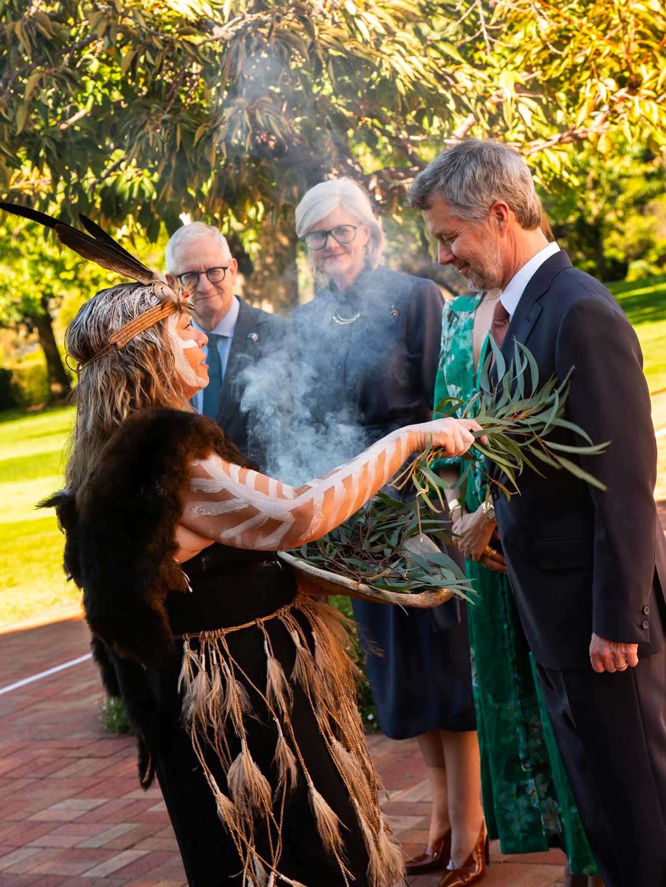 La visite d’État prend à présent une tournure plus formelle et habituelle, en commençant par l’accueil officiel de la gouverneure général Sam Mostyn à la Government House de Canberra. La résidence du plus haut dignitaire du pays est située dans le vaste parc de Yarralumla, au bord du lac Burley Griffin. Avant d’entendre les deux hymnes nationaux, passer en revue les troupes et saluer les membres des deux délégations, le roi Frederik a été purifié à la fumée.