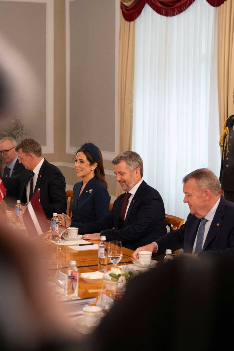 Au château de Riga, le roi et la reine ont également participé à une réunion en présence des deux délégations. Le président letton, le ministre des Affaires étrangères letton, Baiba Braže, et le ministre de la Défense letton, Andris Sprūds ont participé à la réunion, ainsi que la présidente du parlement letton Daiga Mieriņa et la Première ministre lettonne, Evika Siliņa. De côté danois, étaient présents le vice-Premier ministre et ministre de la Défense, Troels Lund Poulsen, et le ministre des Affaires étrangères, Lars Løkke Rasmussen.