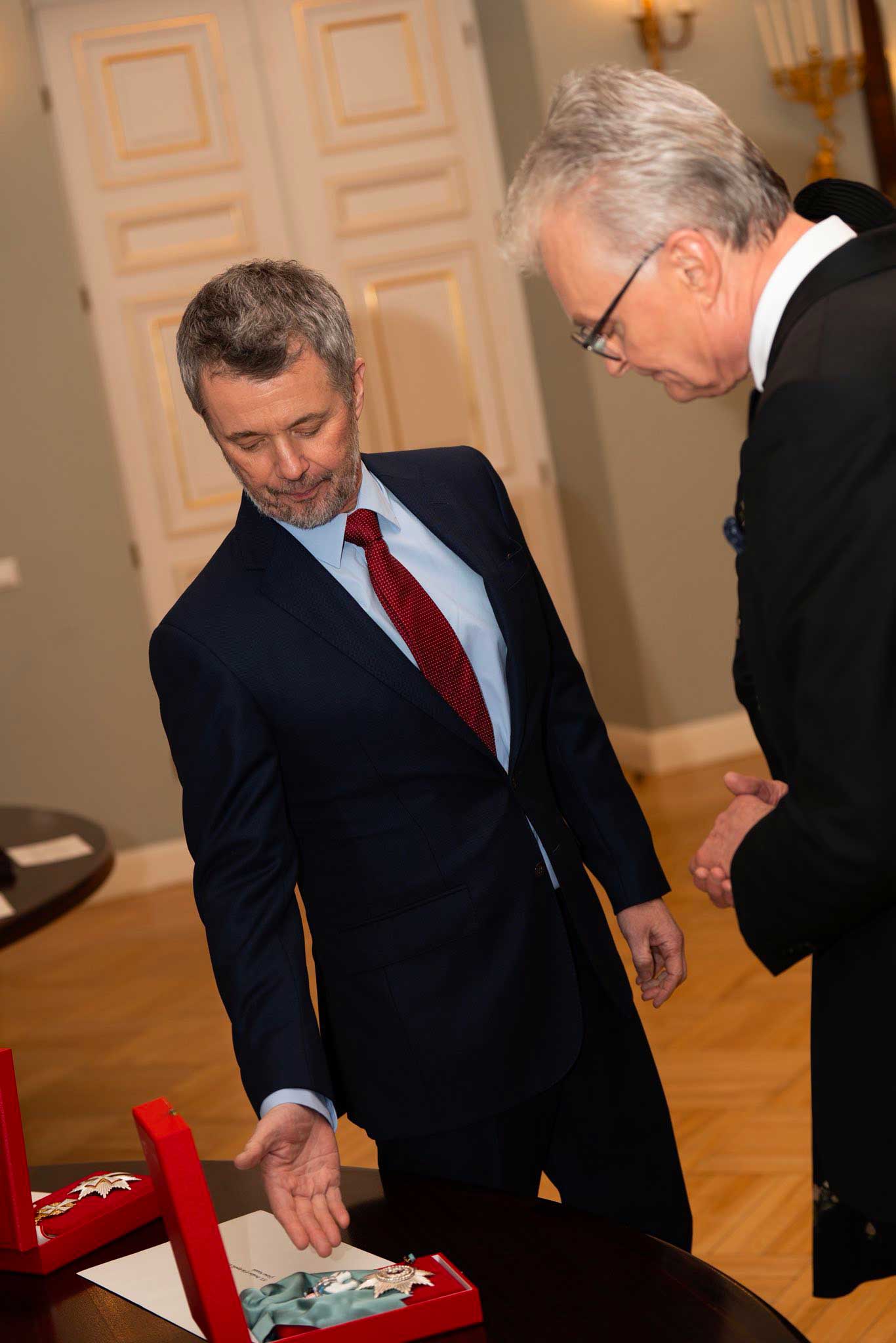 Le roi Frederik a remis les insignes de l’ordre de l’Éléphant au président Gitanas Nausėda, lui permettant de devenir chevalier de l’ordre le plus prestigieux au Danemark. La première dame lituanienne a reçu les insignes de grand-croix de l’ordre de Dannebrog. En échange, le président lituanien a remis les insignes de grand-croix de l’ordre de Vytautas le Grand au roi Frederik et à la reine Mary. Le roi Frederik a reçu le collier de l’ordre, une classe supplémentaire réservée aux chefs d’État.