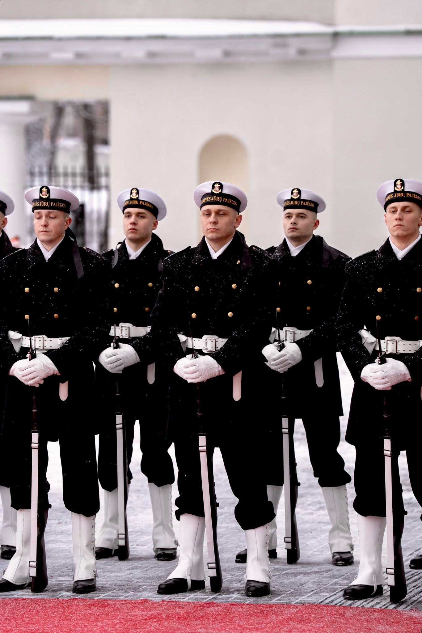 Accueil officiel sous la neige devant le palais présidentiel de Vilnius