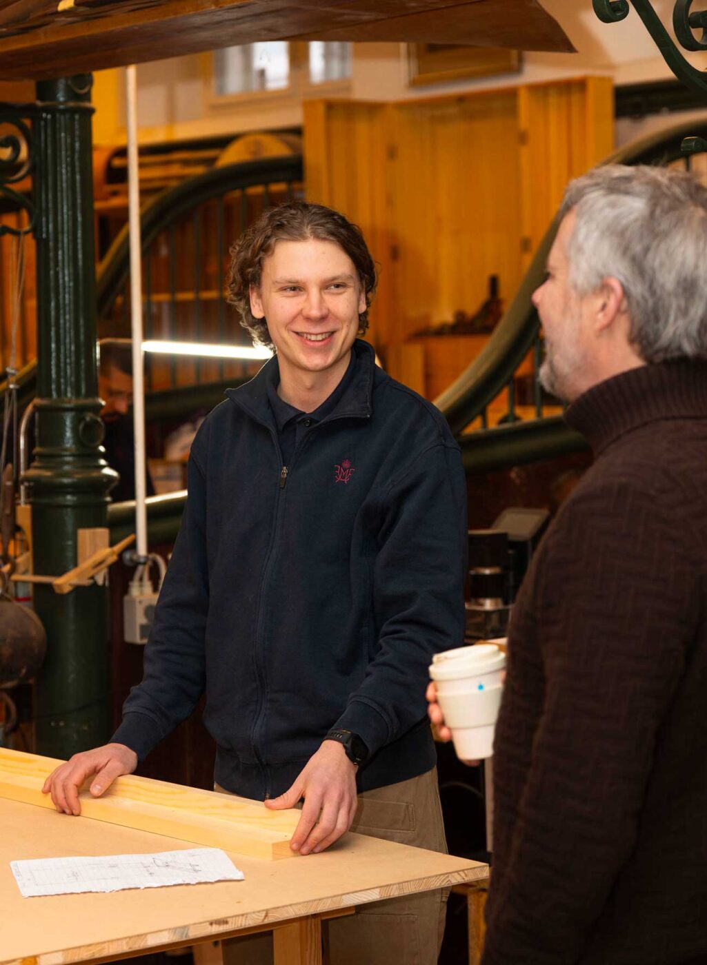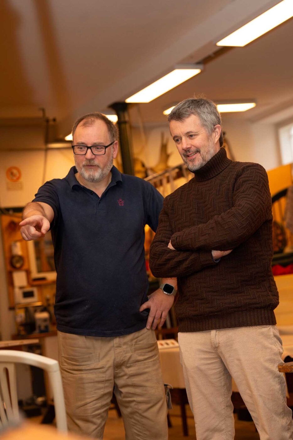 Le roi Frederik X écoute les explications de l’apprenti ébéniste (Photo : Kongehuset)