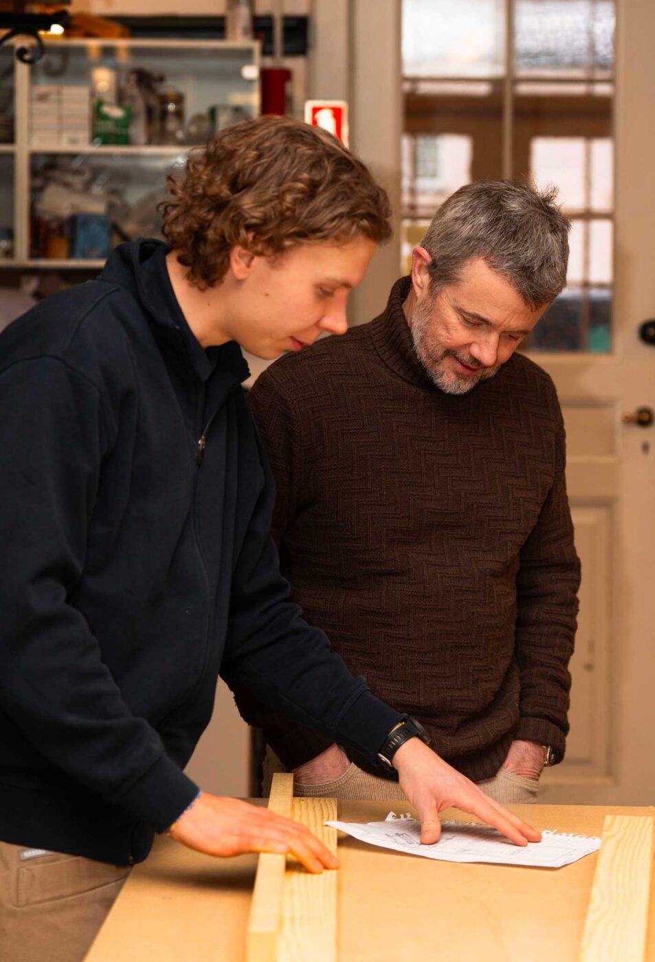 Le roi Frederik X fait la rencontre du nouvel apprenti de l’atelier de menuiserie (Photo : Kongehuset)
