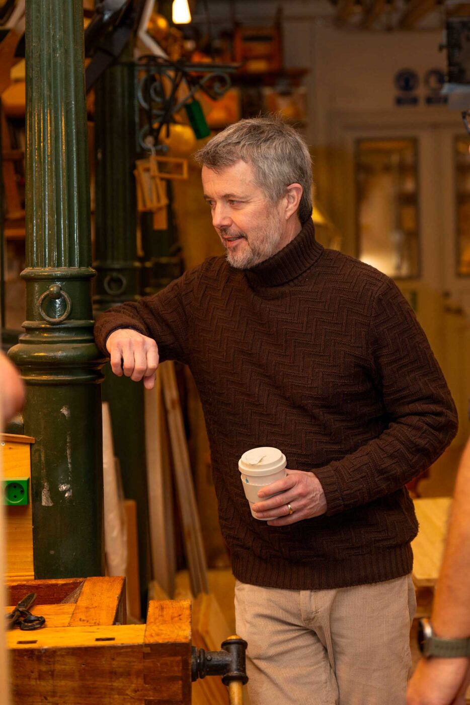 Le roi Frederik écoute les explications données dans l’atelier de menuiserie (Photo : Kongehuset)