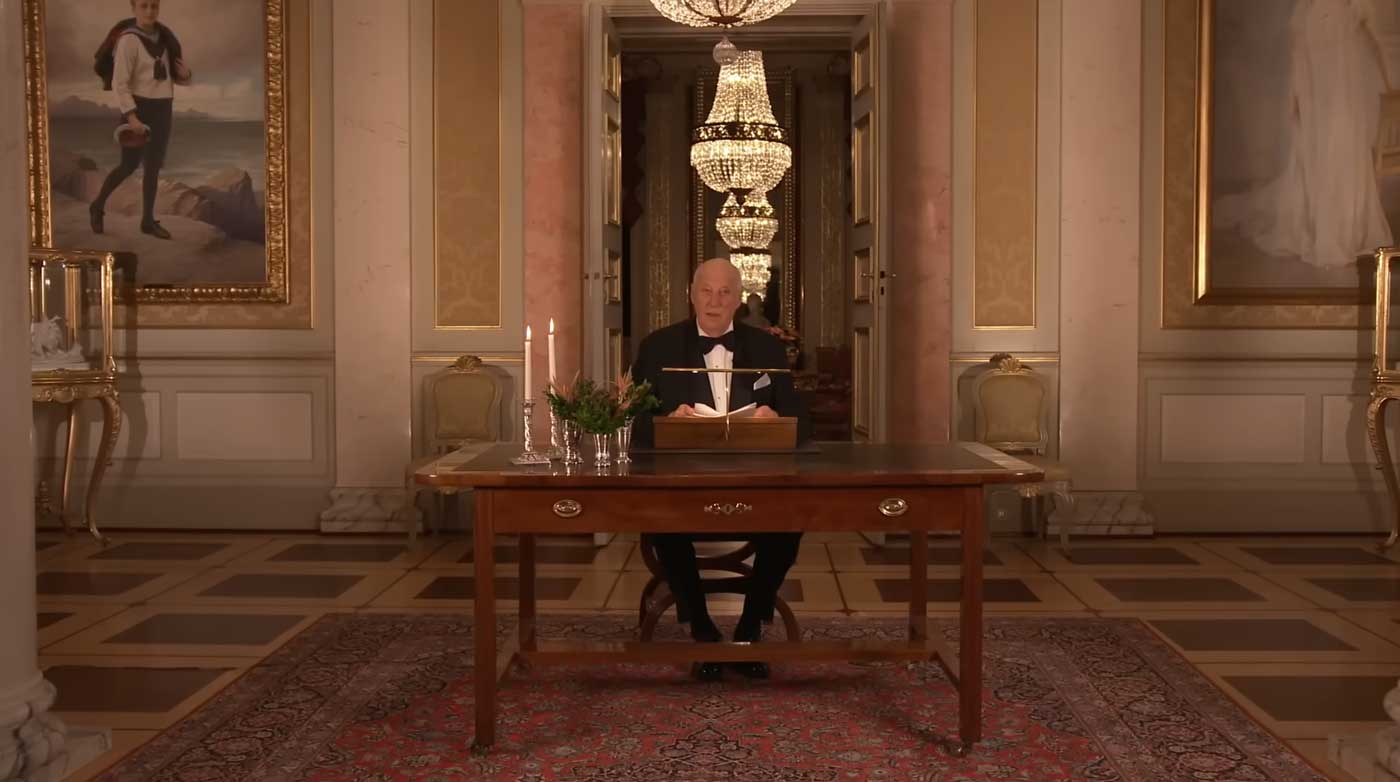 Le roi Harald prononce son dernier discours de l’année 2025 au palais royal d’Oslo (Photo : capture télé NRK)