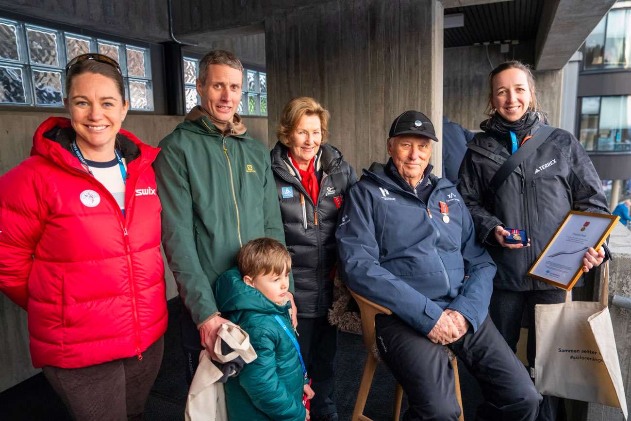 Le roi Harald et la reine Sonja portent tous les deux leur médaille Holmenkollen lors de leur rencontre avec Julie Undlien Wisth, de la Fédération de ski, et Nils Erik Ulset, récipiendaire de la médaille Holmenkollen avec son jeune fils (Photo : Liv Anette Luane, Det kongelege hoffet)
