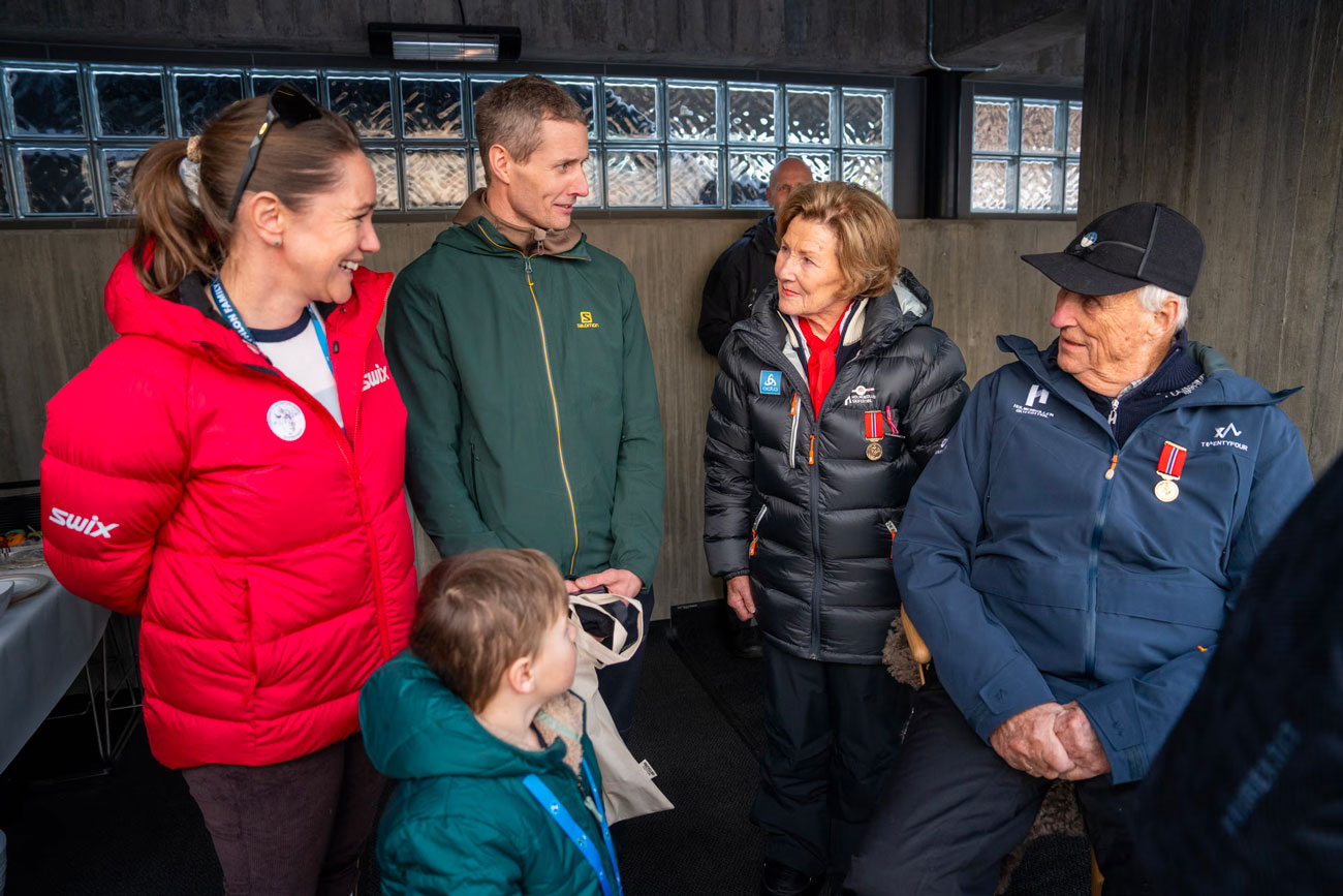 Le roi et la reine de Norvège, entourés de Julie Undlien Wisth, de la Fédération de ski, et Nils Erik Ulset et son fils, et Franziska Preuss (Photo : Liv Anette Luane, Det kongelege hoffet)