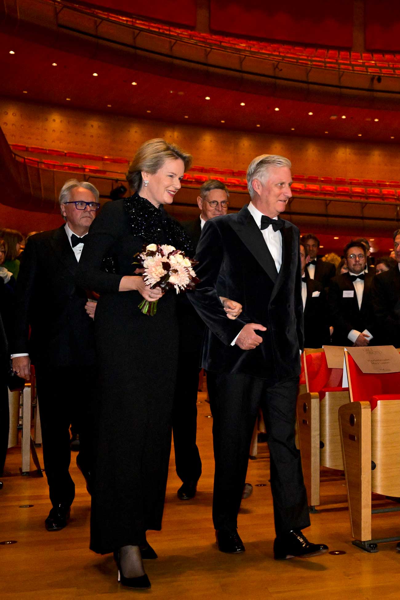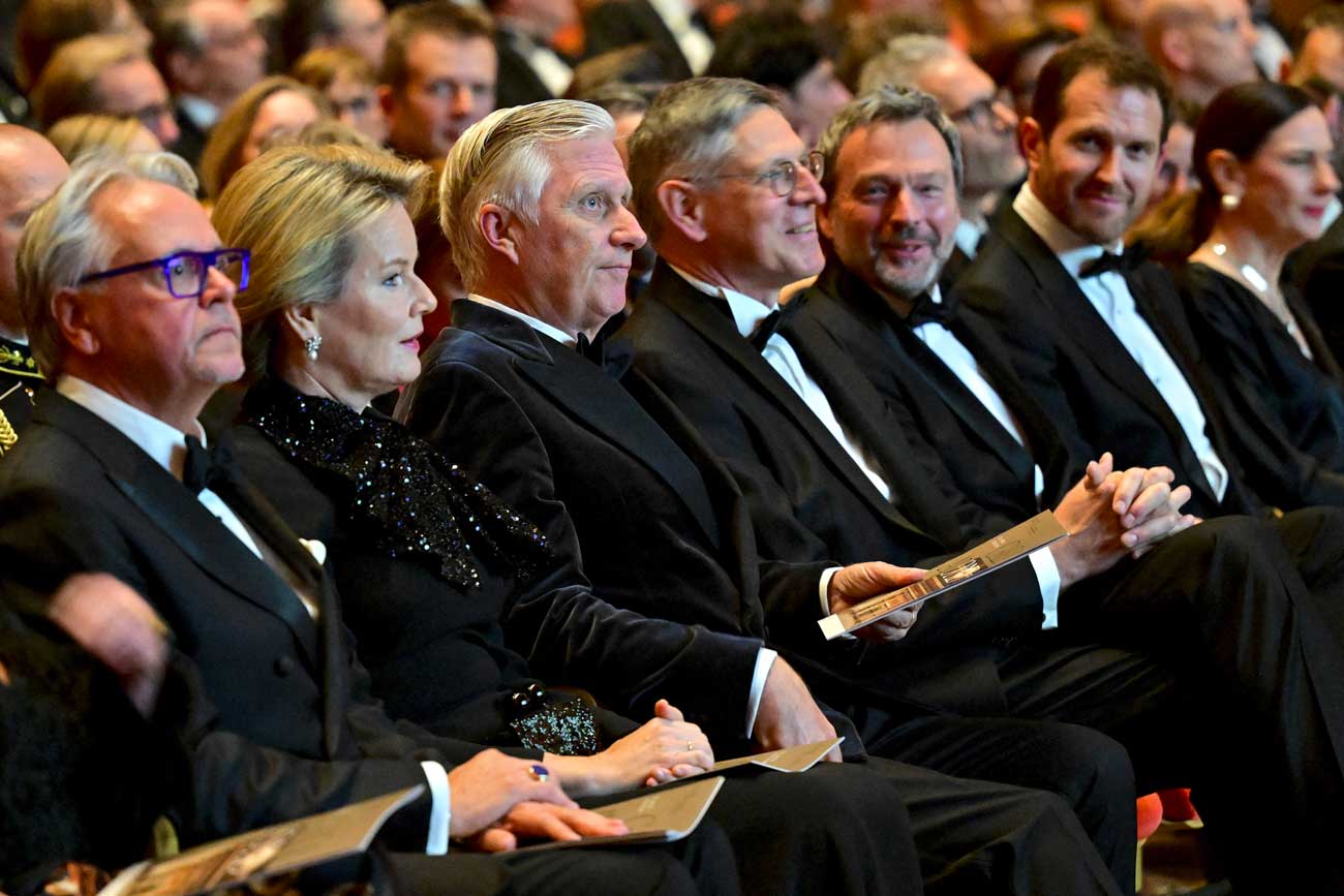 Pour assister à cette soirée d’anniversaire, le roi Philippe portait une veste de smoking en velours. La reine Mathilde avait opté pour une tenue noire déjà connue des observateurs royaux. Comme le rappelle Jelka Van Duyse, la reine Mathilde portait une robe Armani déjà portée en 2023 lors d’un concert de gala organisé pour le 10e anniversaire de règne du roi Philippe. La robe, relativement sobre, est agrémentée d’un large nœud orné de sequins scintillants couvrant le décolleté.