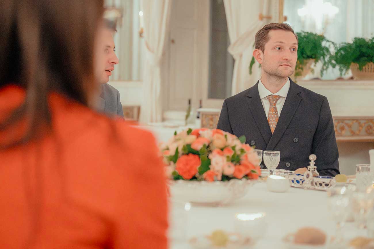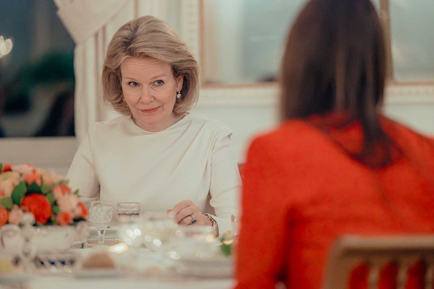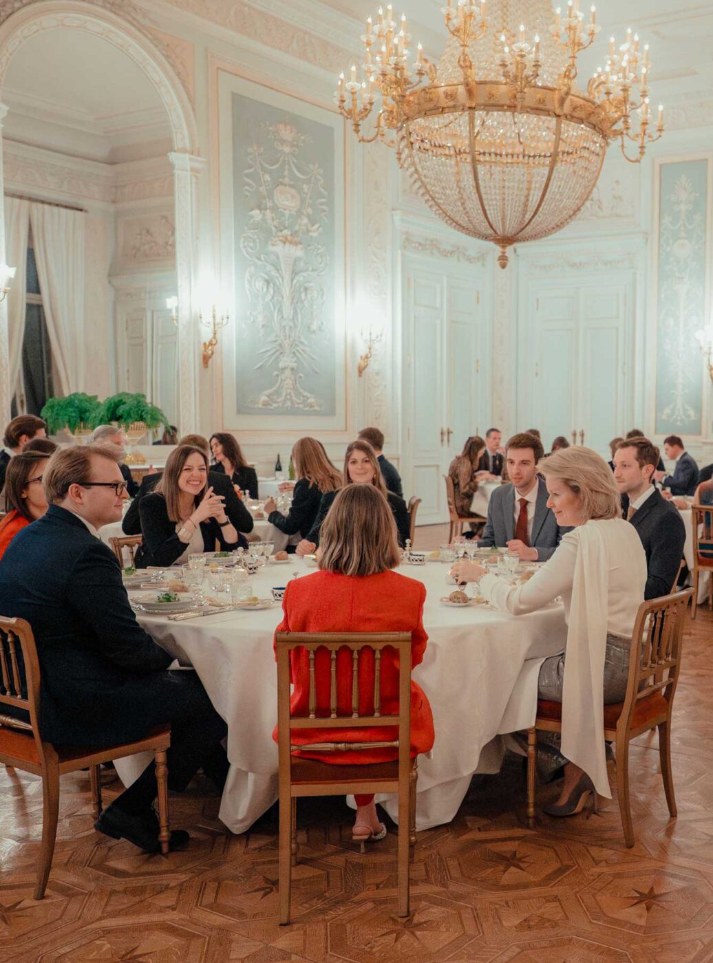 Après une réception avec le roi et la reine, les souverains ont ouvert les portes du grand salon pour dîner à table avec leurs invités. Le roi Philippe a prononcé un discours avant de rejoindre sa place à table. Les dîners en petit comité sont organisés par le Palais sans les annoncer au préalable à la presse, ce qui instaure un climat de confiance propice aux échanges sans formalité.