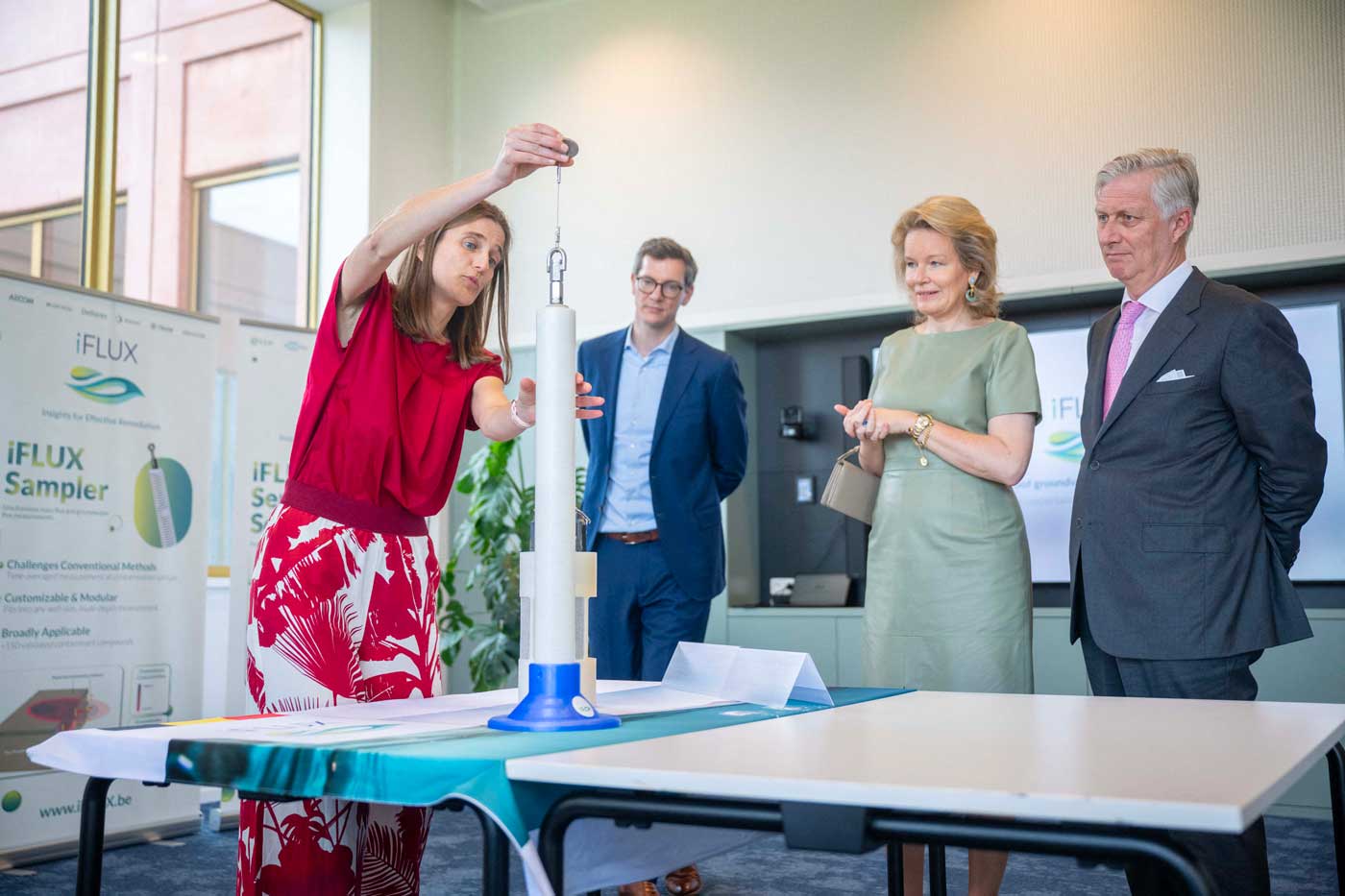Les souverains belges ont participé à une table ronde, puis ils ont assisté à la présentation de la startup iFLUX. Celle-ci est spécialisée dans la protection et la gestion durables des eaux souterraines. iFLUX cartographie les eaux souterraines pour analyser la propagation des eaux polluées, notamment par les PFAS, dans les sols. Le roi et la reine ont découvert la technologie qui a été développée par la startup.