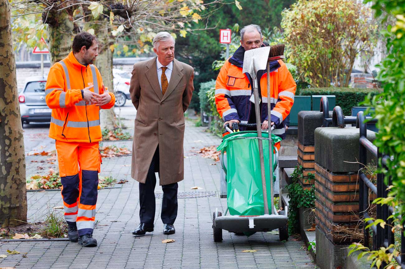 Le roi Philippe se promène dans un quartier avec des éboueurs et des agents de la propreté publique