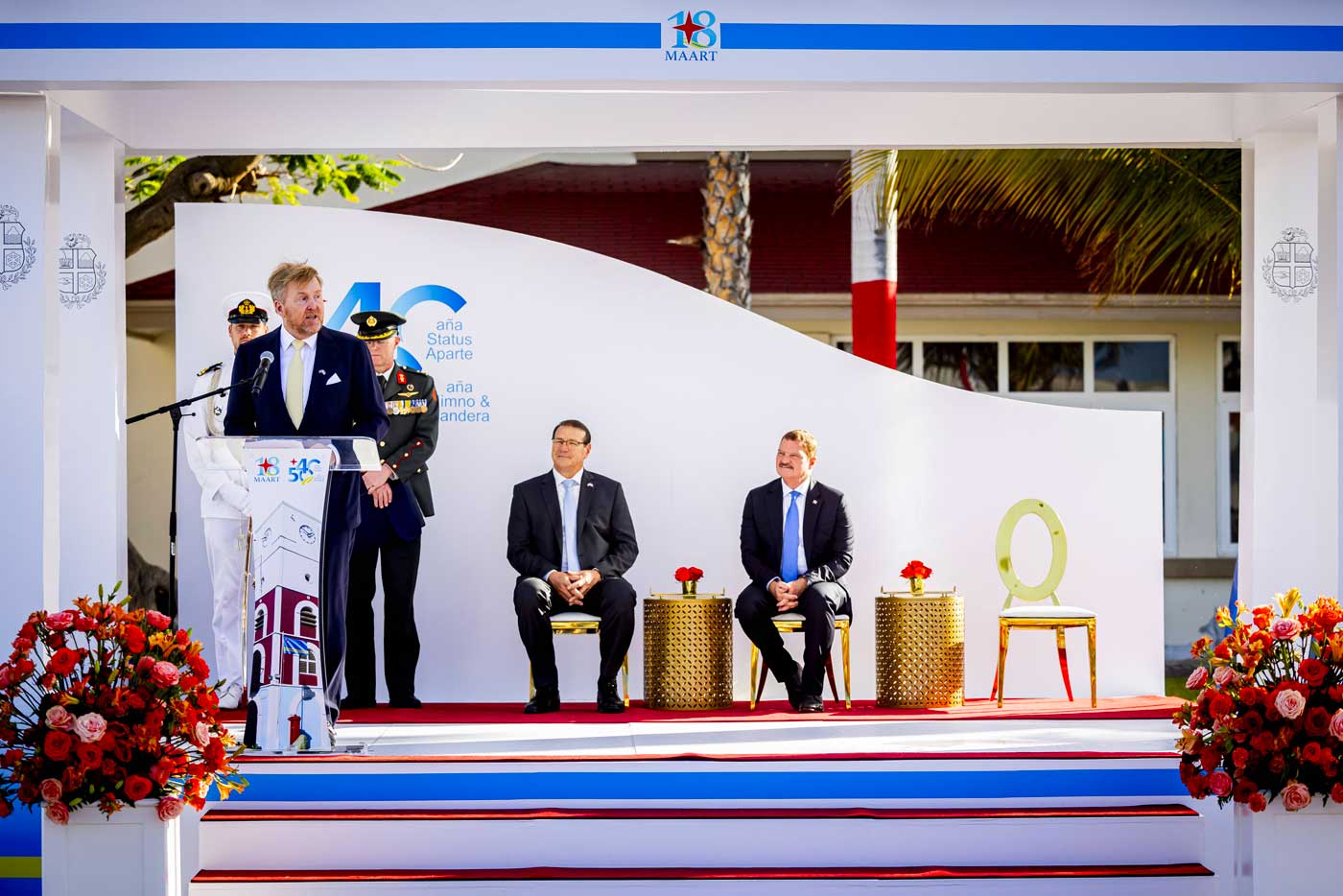 Le roi Willem-Alexander prononce un discours lors de la cérémonie officielle d’anniversaire d’Aruba à Oranjestad (Photo : PPE/SIPA)