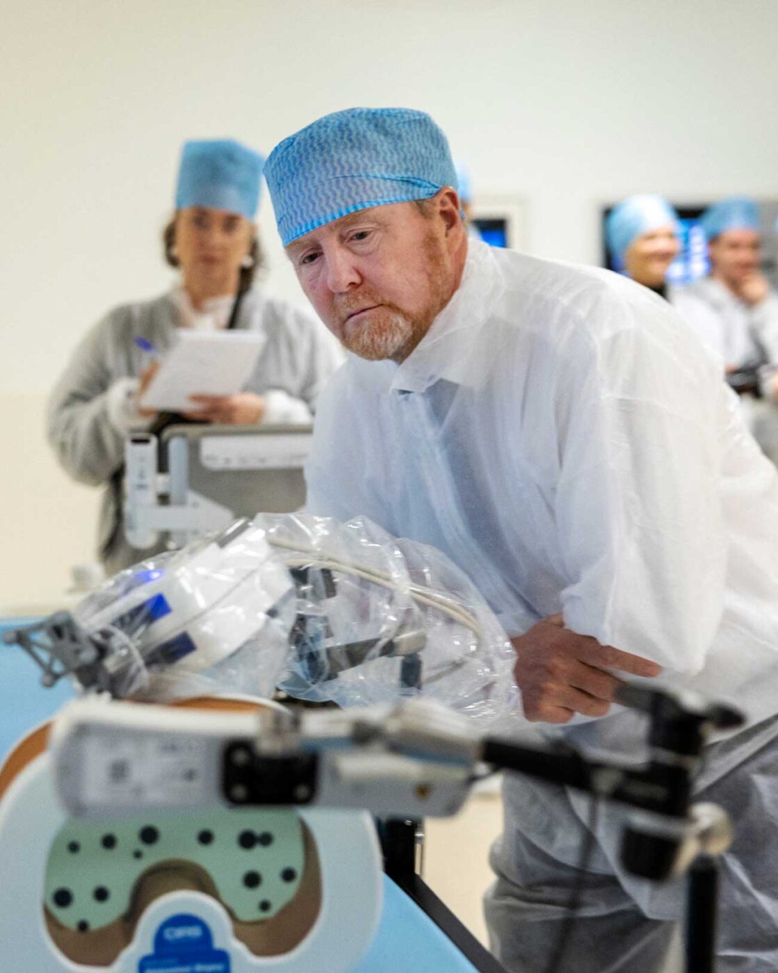 La visite du roi Willem-Alexander a débuté au Centre de thérapie guidée par l’image. Ce centre, ouvert en mars dernier, traite les patients grâce à des techniques d’imagerie, comme les scanners, les échographies et les radiographies de haute précision. Le roi Willem-Alexander a reçu des informations sur l’utilisation de ces thérapies pour des patients atteints de cancer ou de maladies vasculaires. Grâce à l’imagerie de très haute précision, il est dorénavant possible d’opérer sans laisser de cicatrice. Le roi Willem-Alexander a assisté à une démonstration de chirurgie sans incision.