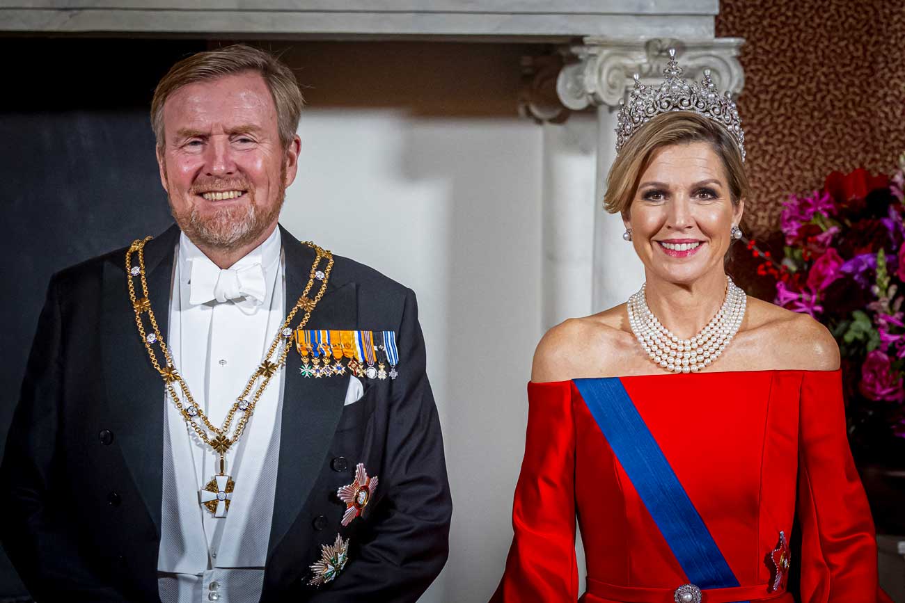 Le roi Willem-Alexander porte le collier de la Rose blanche et la reine Máxima le diadème de Wurtemberg de perles au banquet d’État en l’honneur du président finlandais