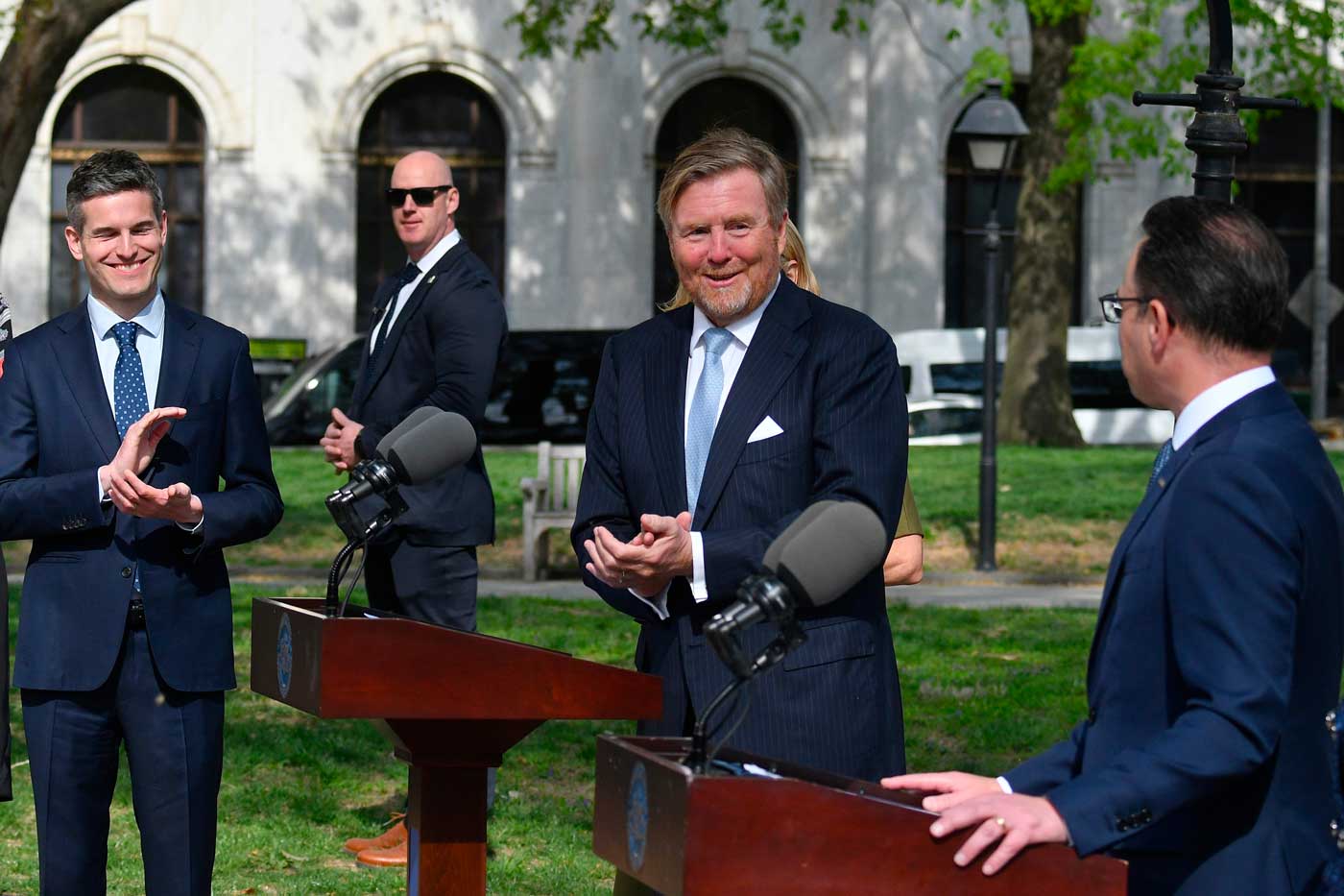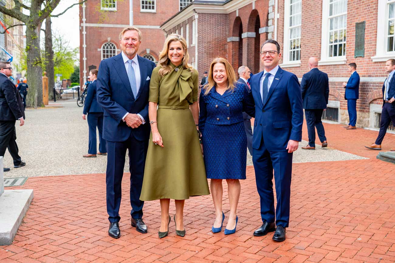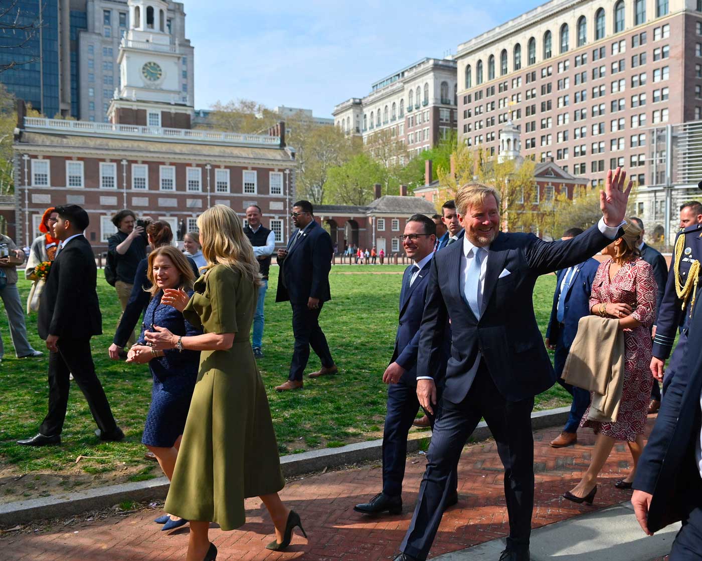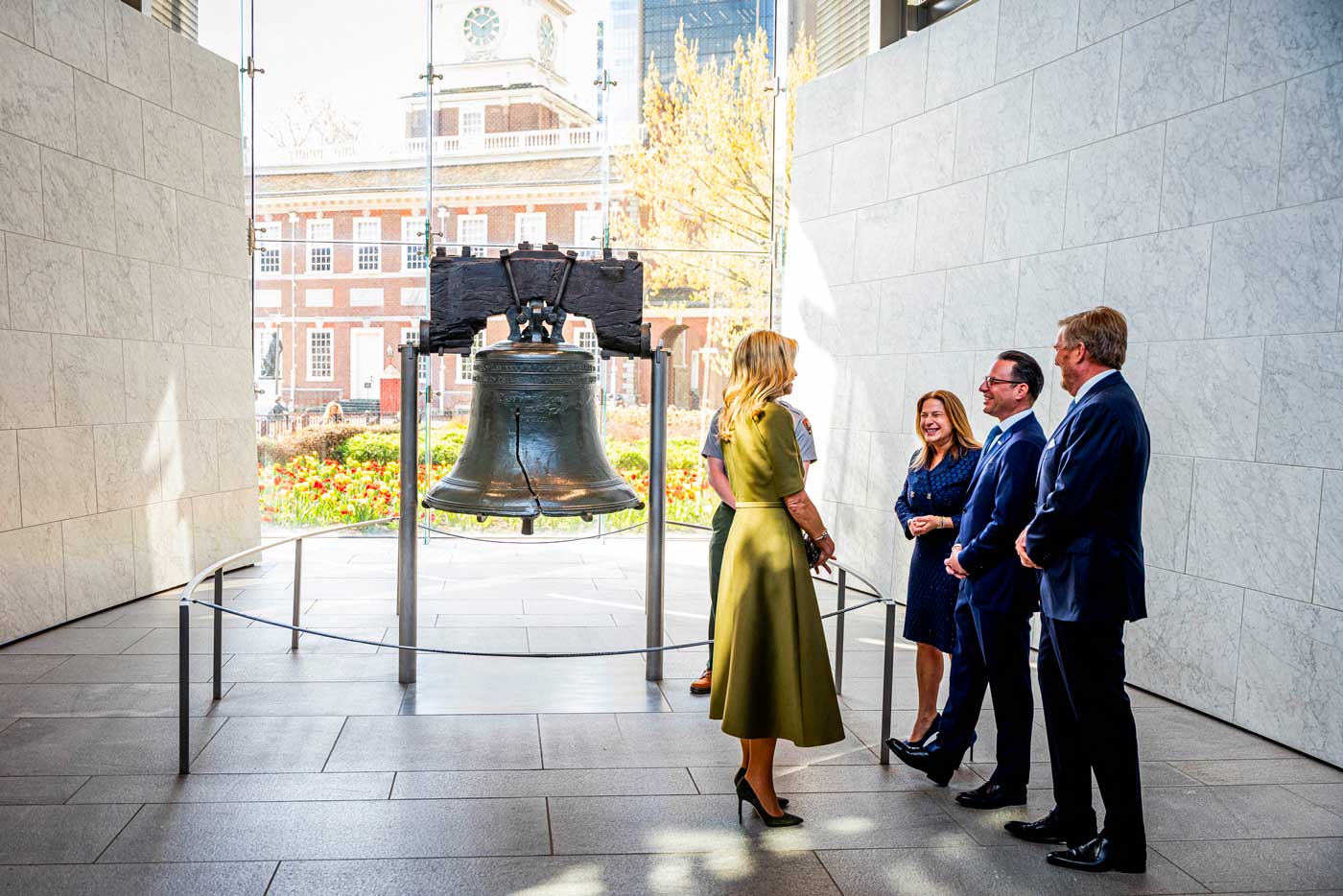 Le gouverneur de Pennsylvanie, Josh Shapiro, et son épouse Lori Shapiro ont accueilli le roi Willem-Alexander et la reine Máxima dans le bâtiment et ont donné quelques explications historiques. Le couple royal s’est arrêté devant la Liberty Bell, symbole de l’indépendance américaine, qui est exposée dans le Parc national de l’indépendance. Cette cloche avait été commandée au Royaume-Uni et fut installée dans le clocher de la Pennsylvania State House, qui deviendra par la suite l’Independance Hall. Selon la légende, la cloche se fêla lorsqu’elle sonna pour la première fois, après la signature de la déclaration d’indépendance. Le roi et le gouverneur ont ensuite fait une brève déclaration à la presse.
