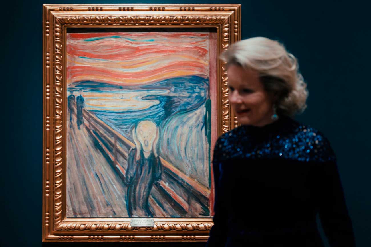 Déambuler dans les 90 salles d’exposition de ce musée gigantesque aurait été impossible ce mercredi soir, alors la reine Sonja a conduit ses invités belges devant quelques-unes des œuvres les plus célèbres, dont « Le Cri » d’Edvard Munch. Ce tableau angoissant existe en cinq versions, qui ont été réalisées entre 1893 et 1917.