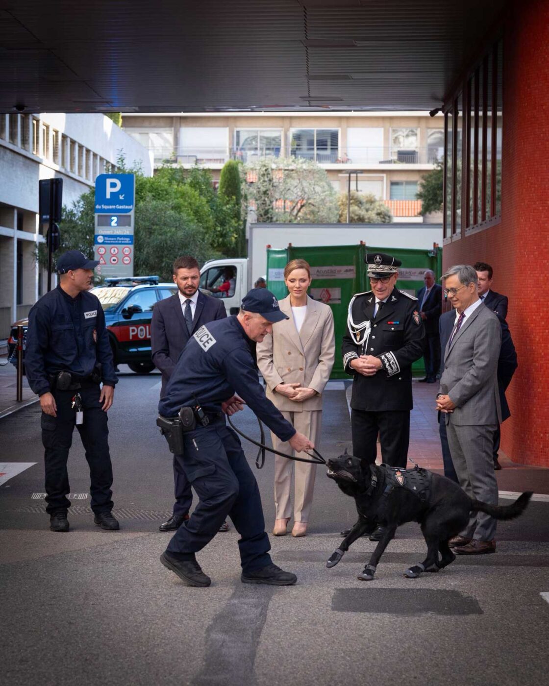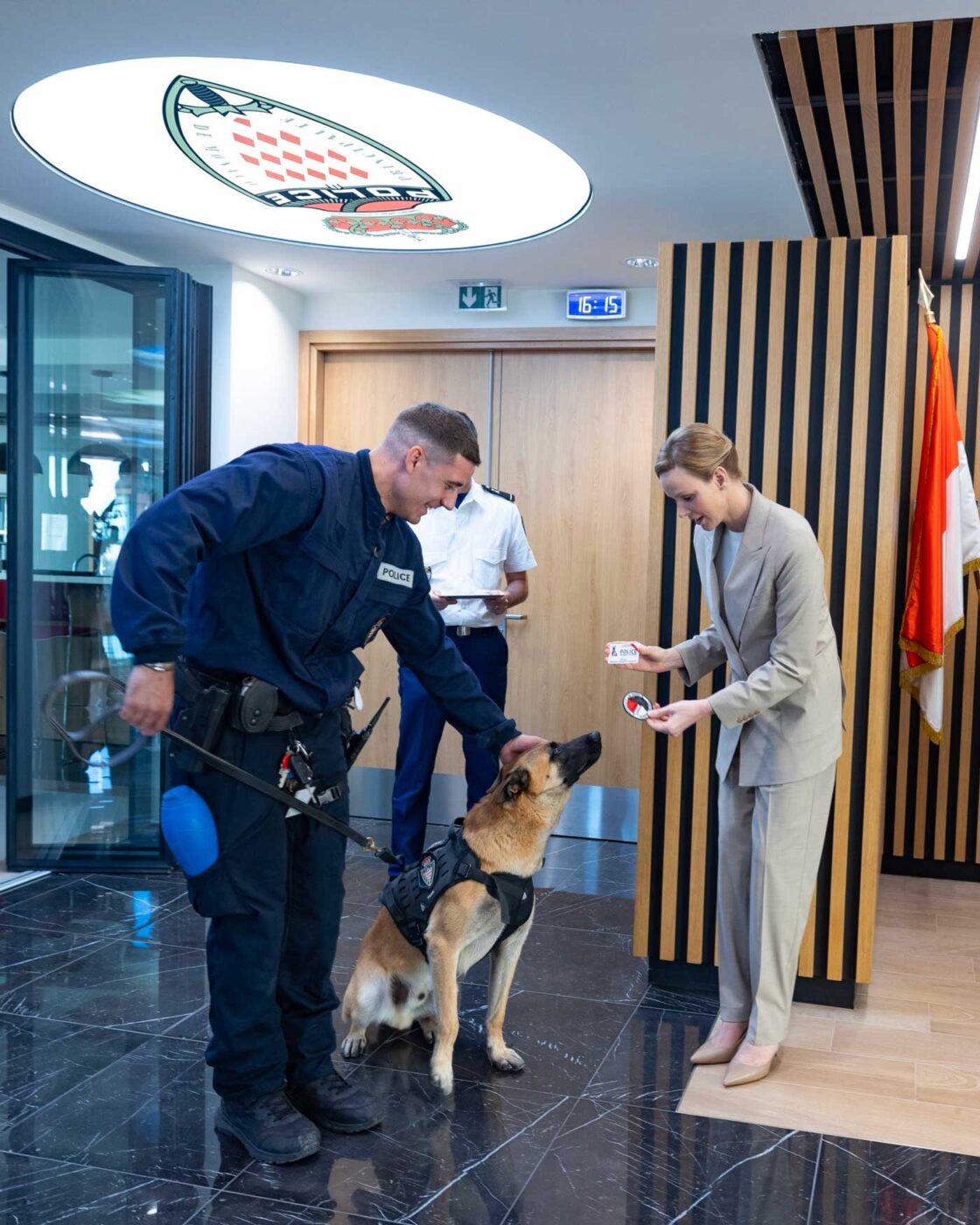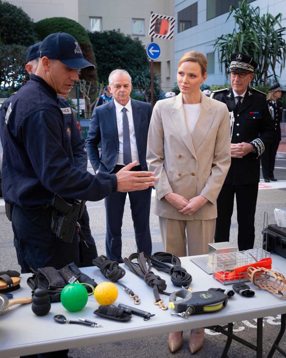 Lionel Beffre, conseiller et ministre de l’Intérieur, Éric Arella, directeur de la Sûreté Publique, ainsi que de plusieurs membres de l’État-Major et de personnalités monégasques, ont assisté à l’événement dans les locaux récemment rénovés de la direction de la Sûreté publique. Lors de la visite, la princesse Charlène a assisté à une démonstration et à une présentation des équipements. Les maîtres-chiens et les chiens ont démontré leurs compétences opérationnelles lors d’un exercice.