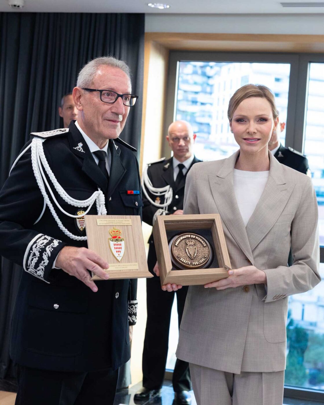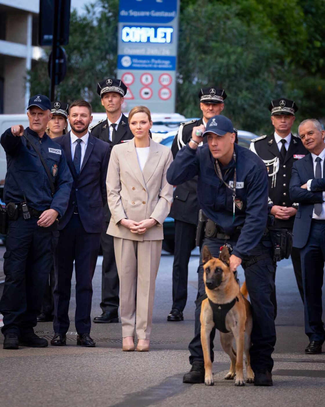 Après la démonstration, une cérémonie officielle a eu lieu dans le salon d’honneur. La princesse Charlène a prononcé quelques mots. Dans son allocution, la princesse « a rappelé que la sécurité constitue l’un des piliers fondamentaux de la Principauté de Monaco, saluant l’engagement et le professionnalisme des femmes et des hommes de la Sûreté publique », rapporte le Palais. Charlène a souligné « l’évolution constante des méthodes et des technologies, incarnée par la création de cette nouvelle unité canine ».