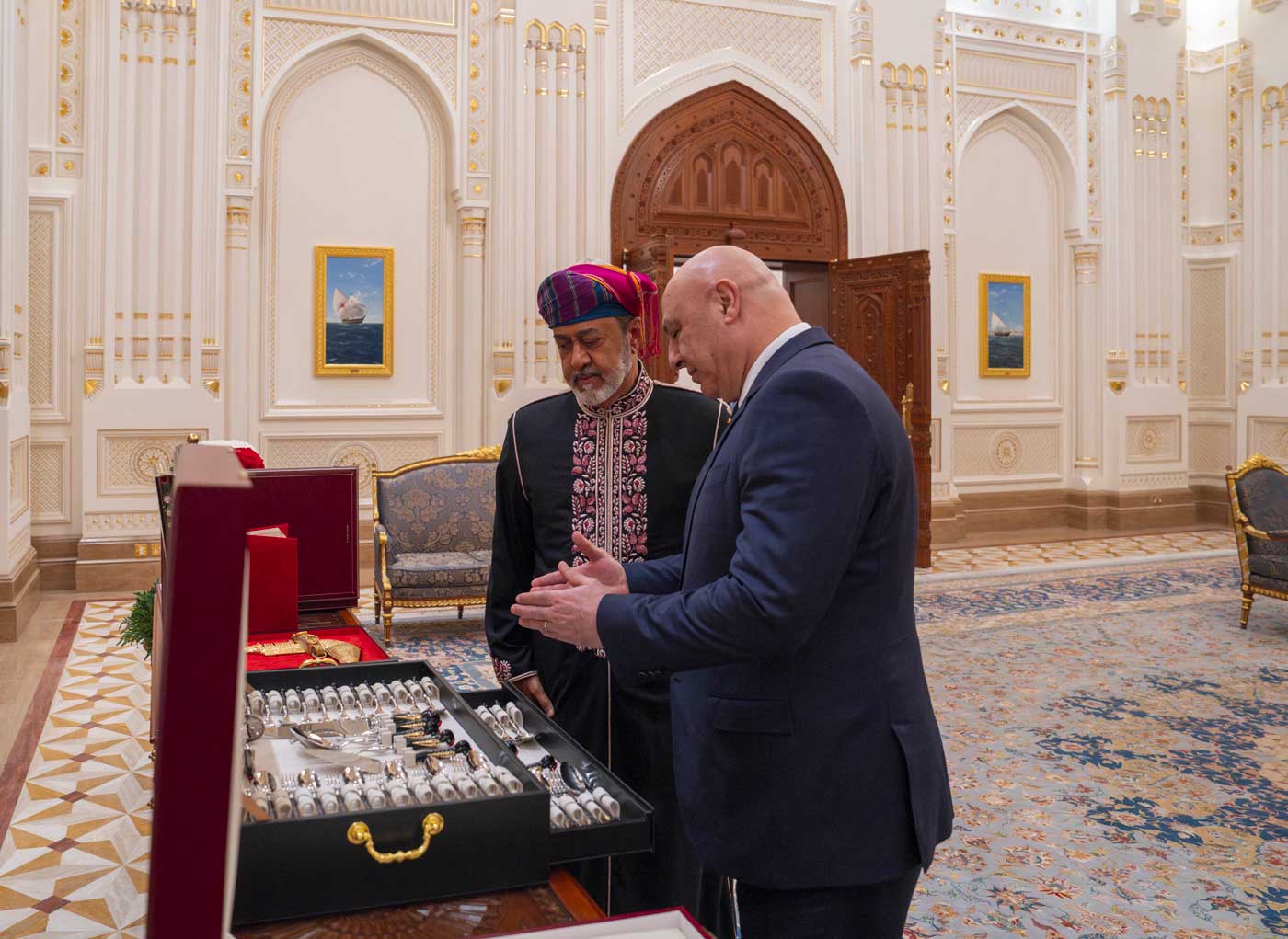 Le président du Liban et le sultan d’Oman ont aussi procédé à l’échange de cadeaux diplomatiques. Sur les photos partagées par le palais, on peut y voir une caisse de couverts comprenant un service complet d’argenterie. On y voit aussi un kadjar, la fameuse dague omanaise qui est l’emblème national du sultanat, qui a été offert au président Aoun.