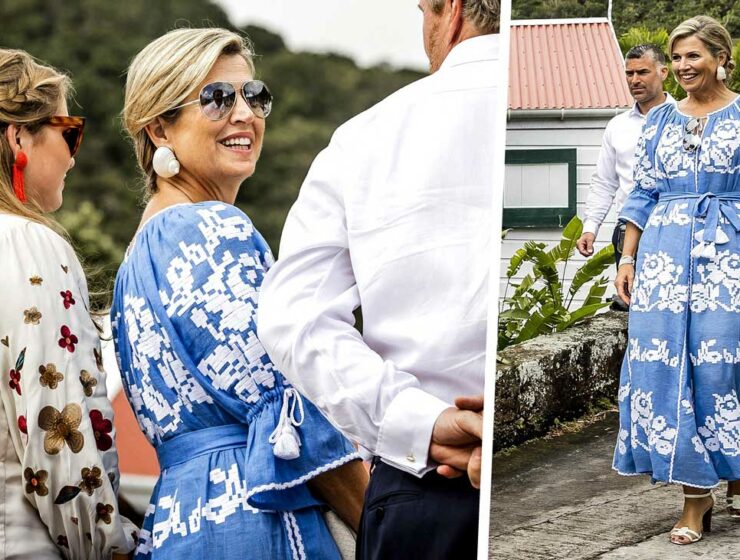 La reine Máxima des Pays-Bas portait une robe bleue à motifs floraux blancs dont les…