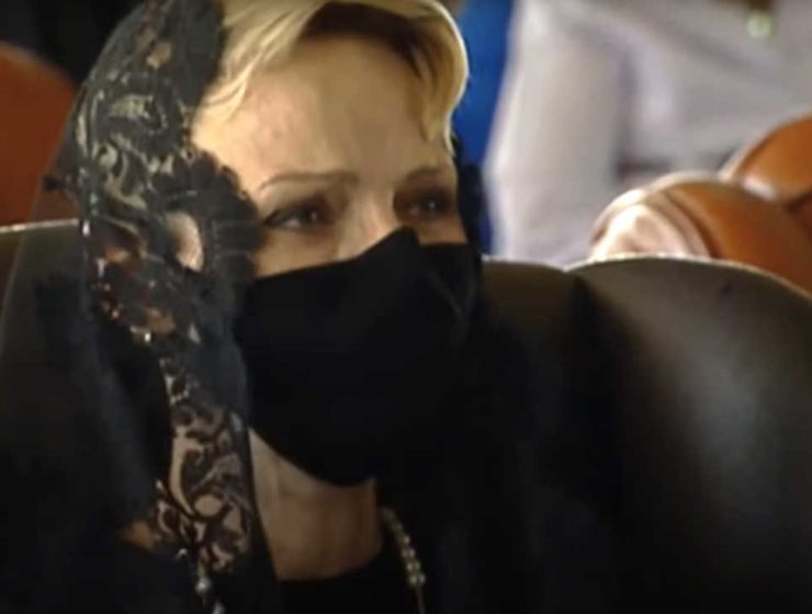 Mantille noire sur ses cheveux blonds coupés de plus en plus courts. Masque noir sur…