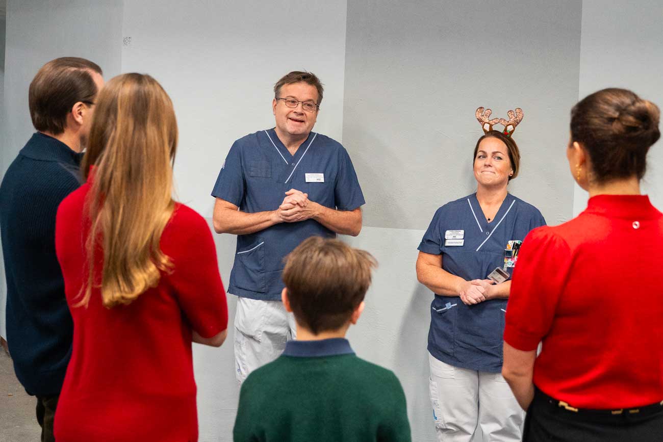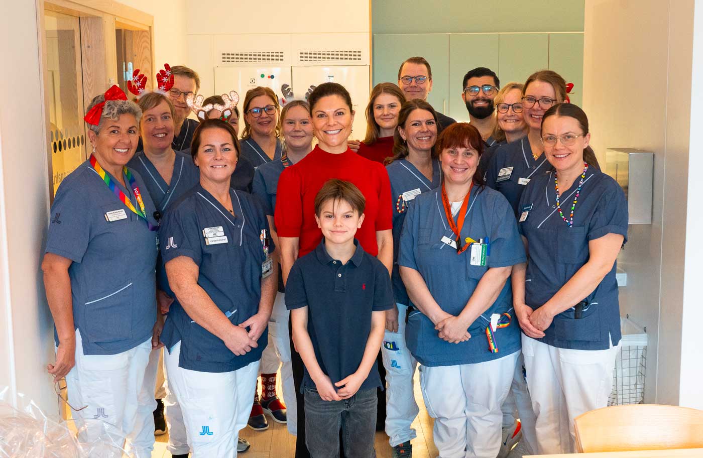 La princesse héritière Victoria, le prince Daniel et leurs enfants auprès du personnel médical en service le soir du réveillon